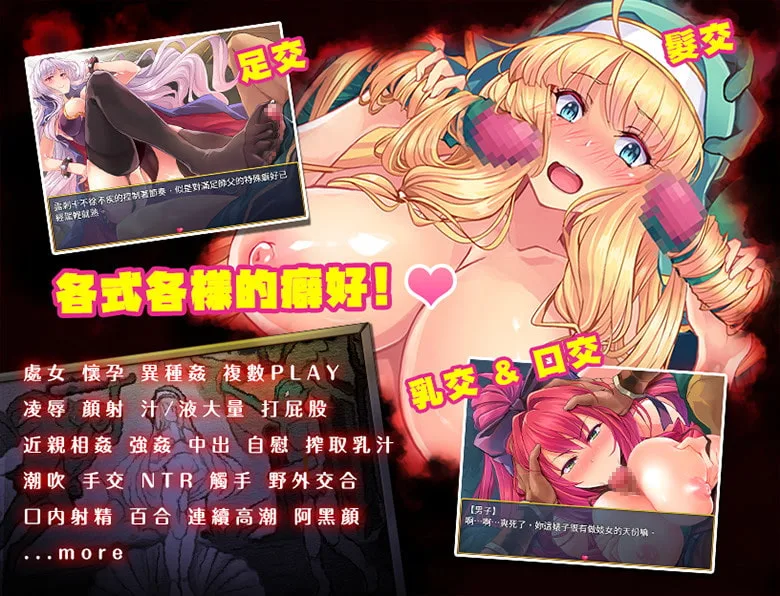 工口部分是凌辱為主,流氓、半獸人、觸手等凌辱,女配也有個別的H或多人運動場景。主要HCG是24張,不過差分多達140張,這是因為在事件中會頻繁更換差分來做演出的關係。