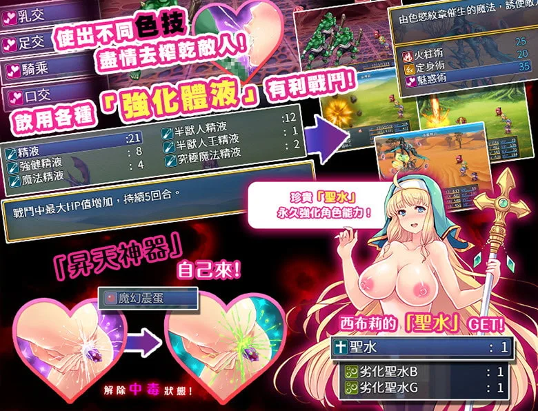遊戲的部分是傳統式的回合制戰鬥,戰鬥中敵我雙方都能使用色情攻擊,像女主能從對方身上榨出可以增加防禦力的強健精華,另外色情攻擊是做成小圖cut in特效。