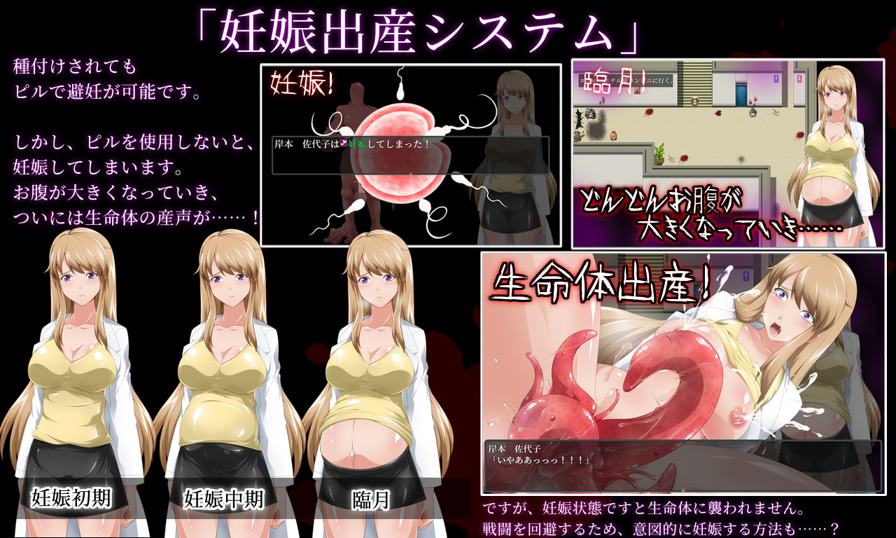 設定上被不明生物侵犯到懷孕、生產的周期大約只要數個小時,所以在女主躲藏的這三天內看到了有個女性不斷的被侵犯、懷孕、生產出更多怪物。氣氛上是那種淫獸末日的感覺,不過可以放心這不是恐怖遊戲。