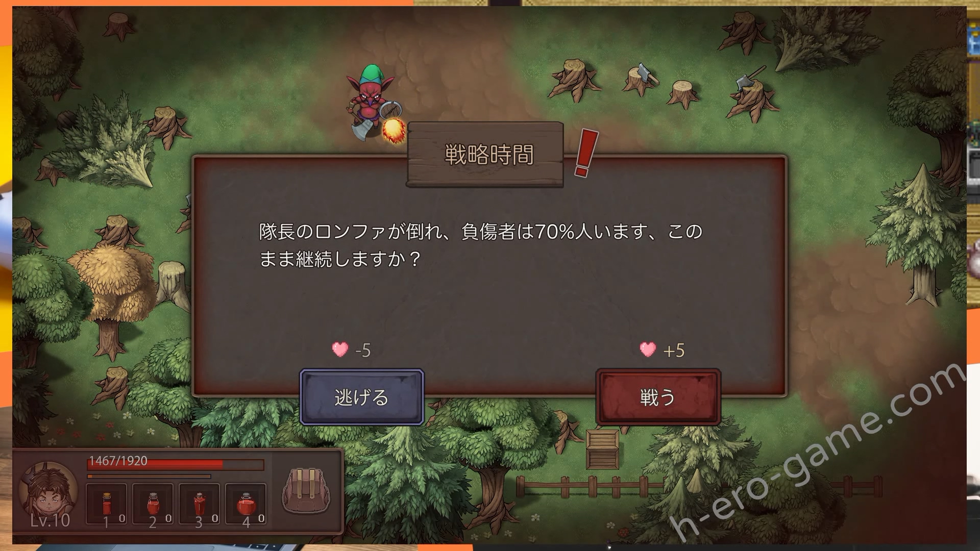 如果隊伍中的隊長被打死的話,男主可以選擇要逃走或是繼續戰鬥,不過逃走會扣信賴。要是有提升男主的等級跟強化裝備的話,其實也是有可能打贏的,打贏的話會得到很高的信賴。於是最理想的狀況是把冒險者帶到他們很難打贏的地方,在接近全滅的狀況下獲得勝利,信賴、錢都能賺到。