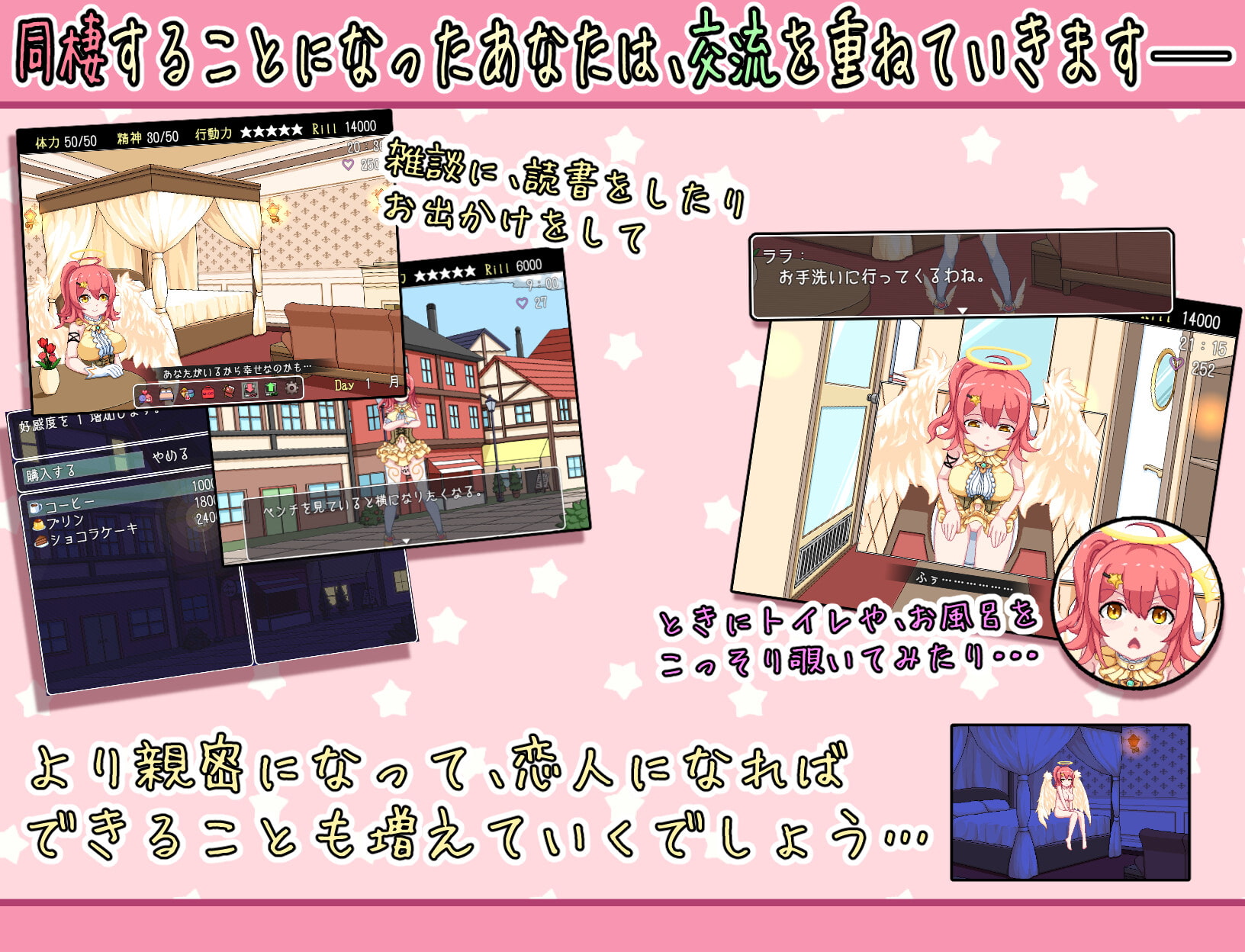 再來就是天使去上廁所、洗澡的時候去偷窺,不過要是被發現的話會降低好感,而且被天使罵會扣精神。