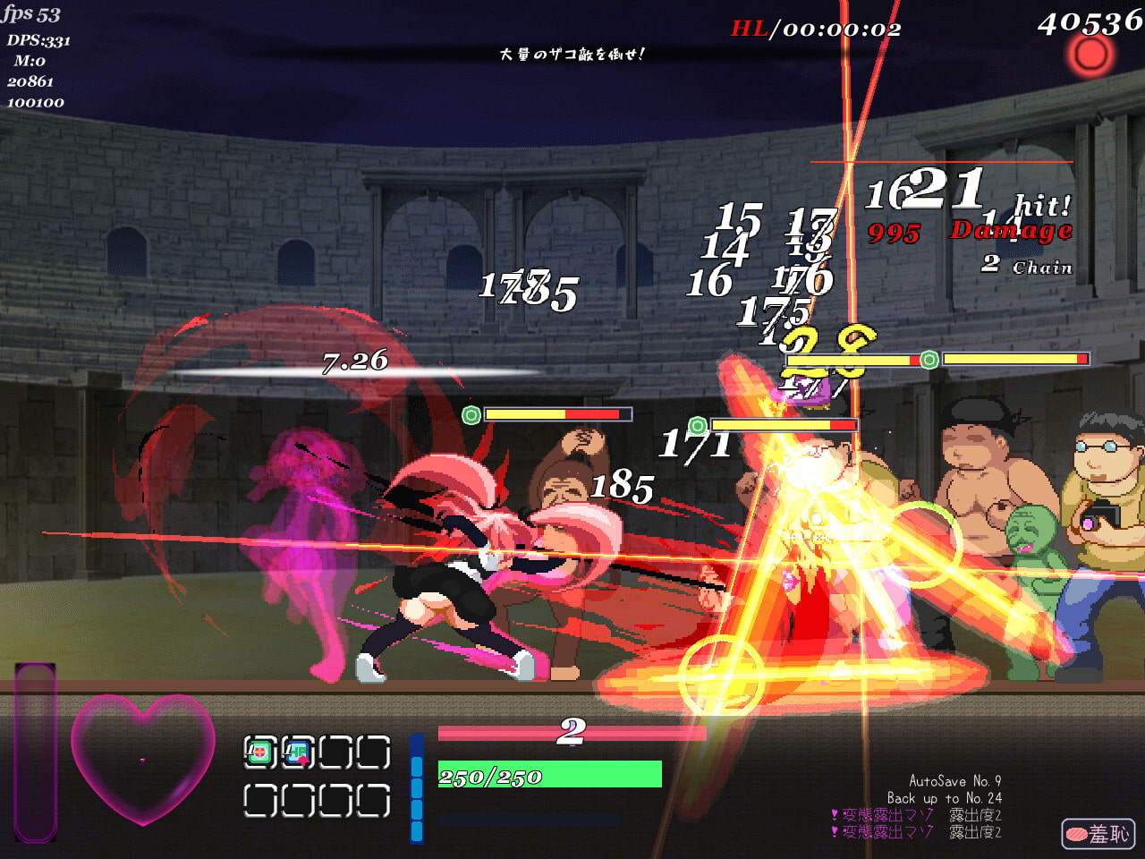 擊中敵人時的擊退效果相當爽快,透過方向加攻擊這樣簡單的方式就能觸發多種動作,因此可以享受華麗的戰鬥而且不需要複雜困難的操作。另外有簡單到地獄的四種難度,不管是想輕鬆攻略看色圖或尋求高難度動作遊戲的玩家都能夠滿足。