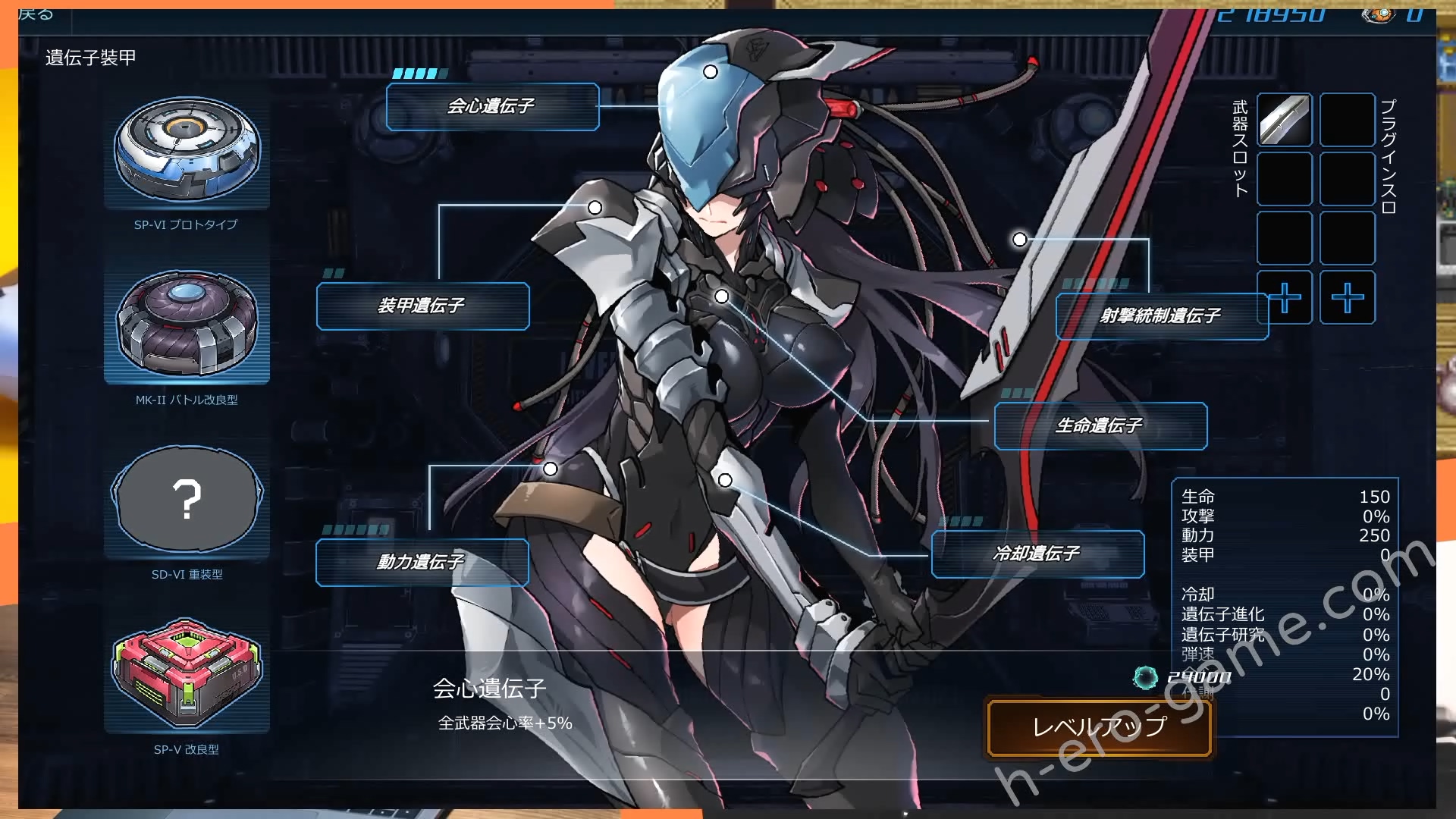 個人的攻略建議是分子ブレード加冷却遺伝子突變成「虚空刃」,速射ミサイル加武器速度突變成「ストームミサイル」,還有オートキャノン加エネルギー吸収(遊戲內名稱與官方攻略所寫的不同,攻略是寫吸収遺伝子)進化成「ガトリング自走砲」。