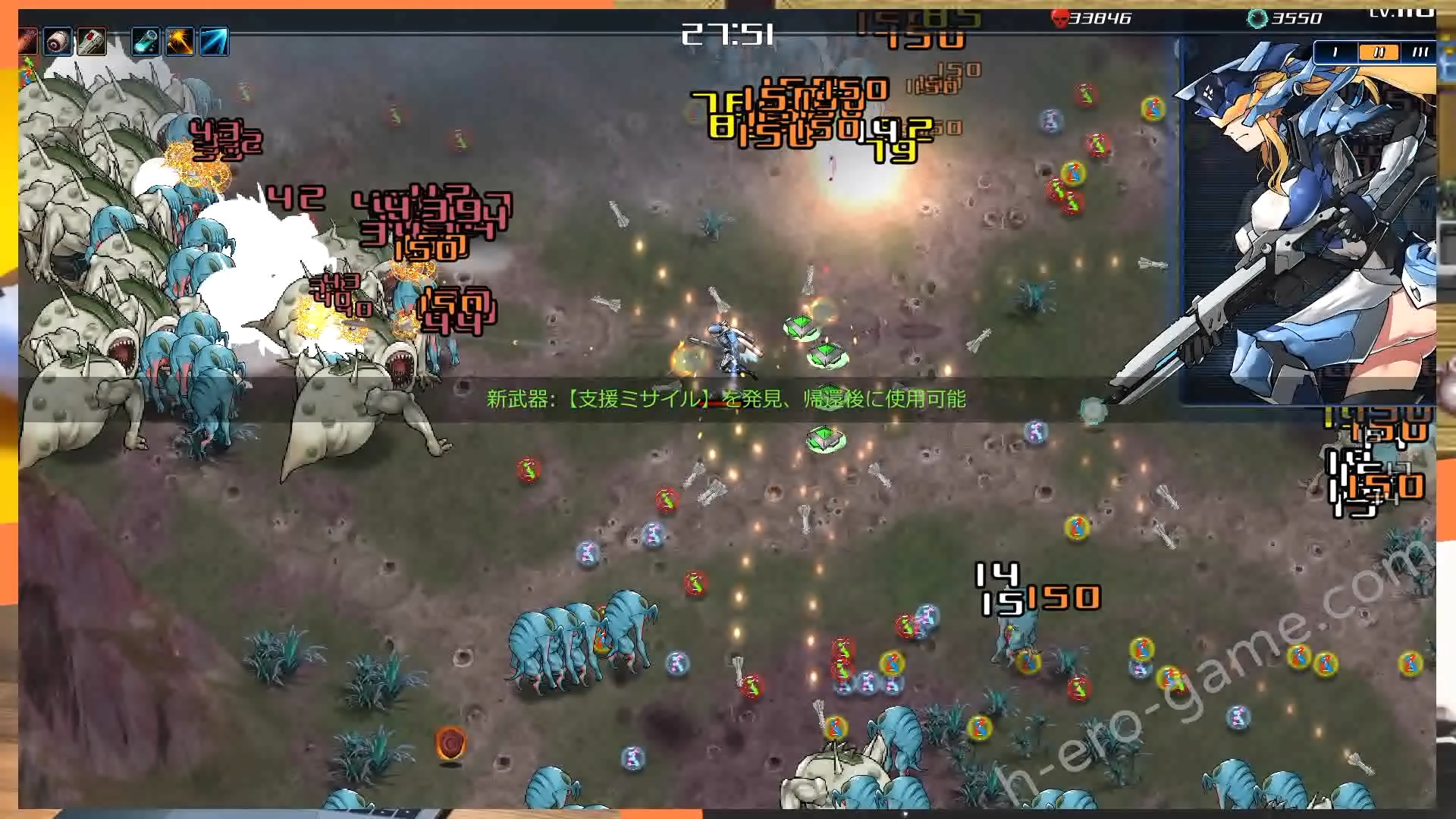 有這三種超級武器之後基本上到27分之前都可以站著發呆,頂多注意一下帶黃色光環的頭目就好。而且上述的這幾樣大多都是初期裝備,エネルギー吸収只要打20分鐘的丘陵1科目就能取得,前期就能夠入手。