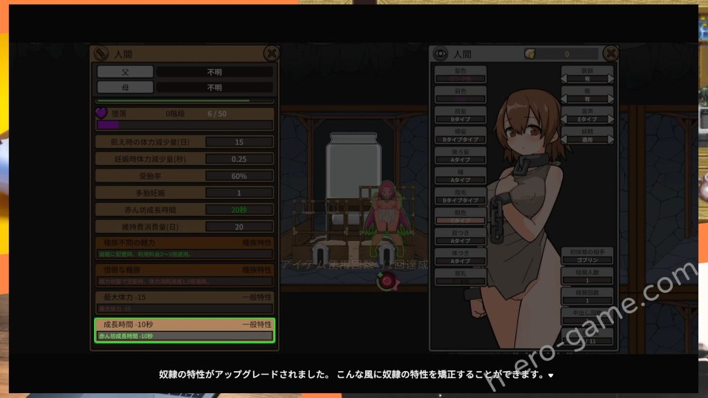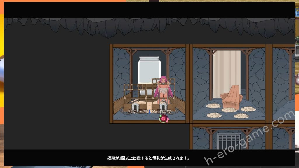 可是其實奴隸有最高出產上限,像人類初始能力下是可以生十一胎,生了第十一胎之後除非使用道具恢復,不然就無法再生產也無法產出母乳。所以其實要持續產出母乳是要把產奶專用的奴隸移動到奴隸房間,等奶量多了之後再移回榨乳室。