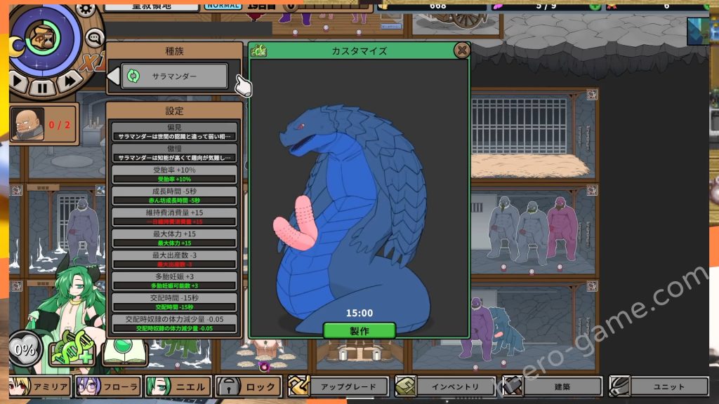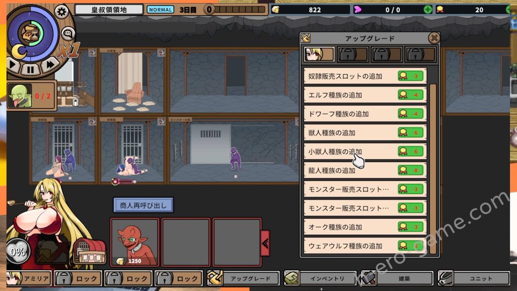 初期的時候賣掉魔物是唯一的收入來源,不過說到這應該也發現其實這樣的過程需要頻繁的做拖拉的動作,而且遊戲暫停的時候也不能移動畫面也不能拖拉奴隸跟魔物,在初期弄出五、六間繁殖室的話絕對會手忙腳亂,最好是等到解體所開放,有自動精靈幫忙處理這些拖拉的操作之後再擴大繁殖室的規模。