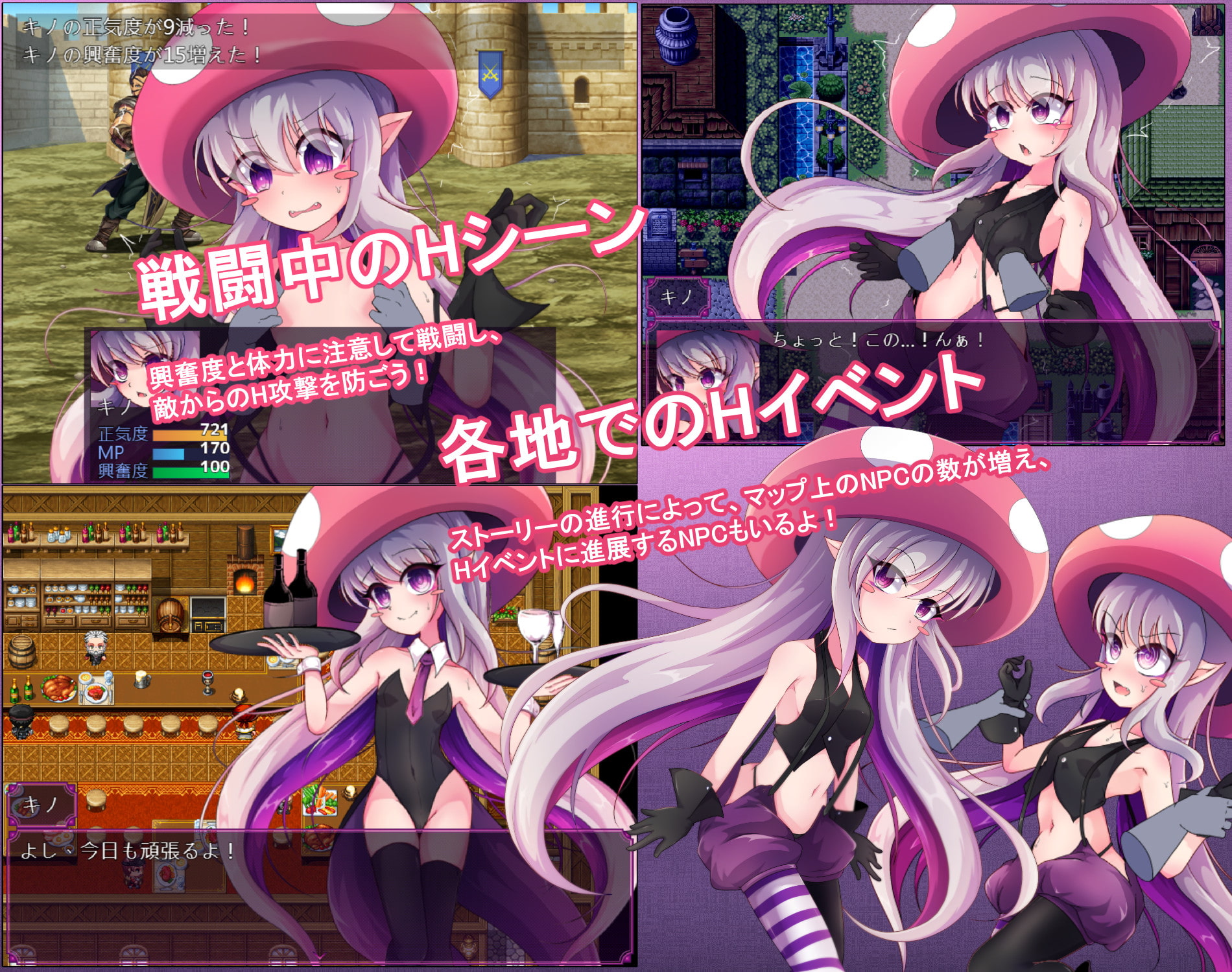 遊戲的部份是色情攻擊為主的回合制戰鬥RPG,敵人見到魔菇人不是衝上來強吻就是襲胸襲臀,完全沒有攻擊行為。不過魔菇人被騷擾時會漸漸喪失理智,要是理智見底就會被侵犯,另外這些騷擾攻擊也會增加興糞度,興奮度滿的時候也會被H然後扣大量理智。