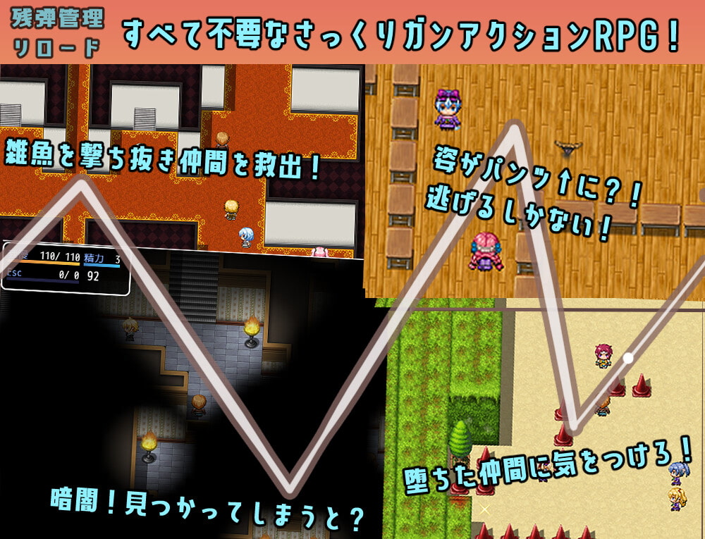 雖然是彈數無限也不用填彈的射擊遊戲,但是女孩子們也跑得很快。被女孩子追上之後就會開始色誘,而色誘的方式有兩種,一種是很傳統的方向鍵連打之後逃脫。