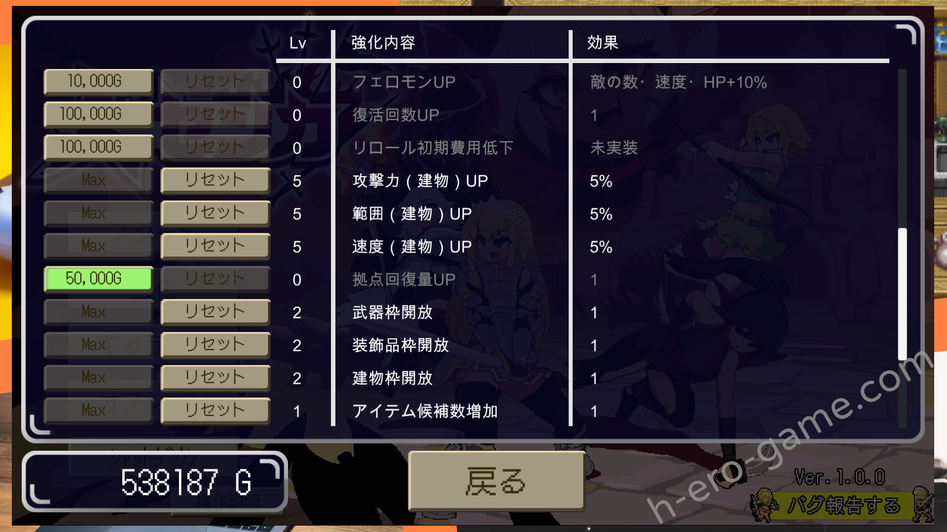 而在關卡中獲得的金錢除了可以重抽升級的獎勵之外,在標題畫面時也可以拿來點強化,在這點的強化效果是全角色共用的。
