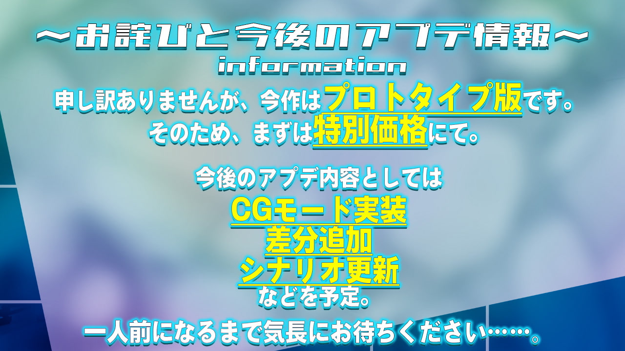 雖然根據開發社團的說法,目前遊戲還是早期測試階段而有「特別価格」。不過預計追加的內容是差分跟劇情,遊戲部分應該不會有變動。