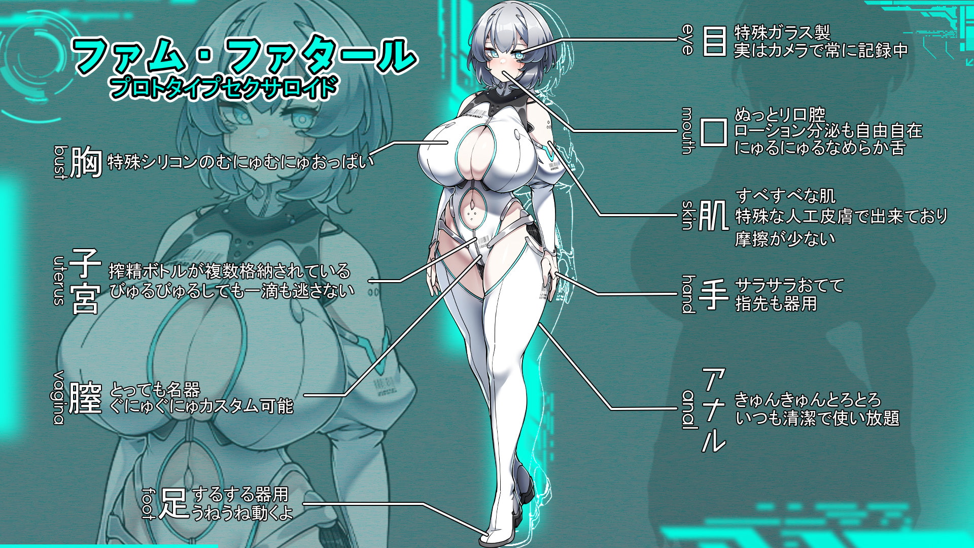 但再怎麼說,女主畢竟只是機器人,無表情的榨精才是常態。就算在H的時候被看出有感情的表現,也會發出嬌喘聲。但這全部都只是為了收集資料而配合男性的喜好而已,你在H時所看到的都只是演技。