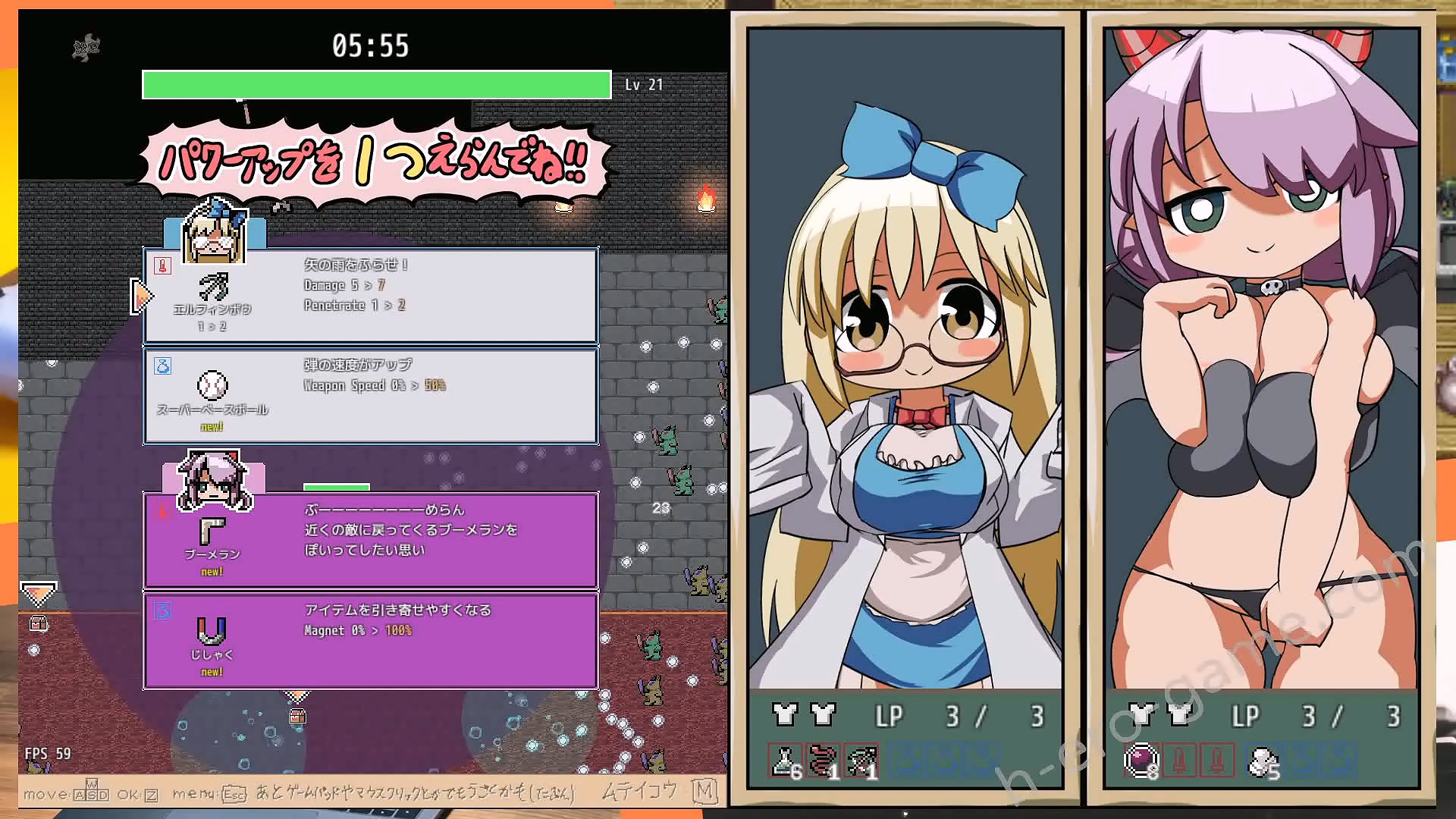 也是在升級會有一堆的武器跟道具可以選,不過兩個女角的裝備是各自獨立的。武器不用說是各用各的,道具也是互不通用而且拿過的就不能再拿。像是暴力JK拿了啞鈴之後啞鈴就不會再出現,而且啞鈴的攻擊力增加的效果也只作用在女主身上。