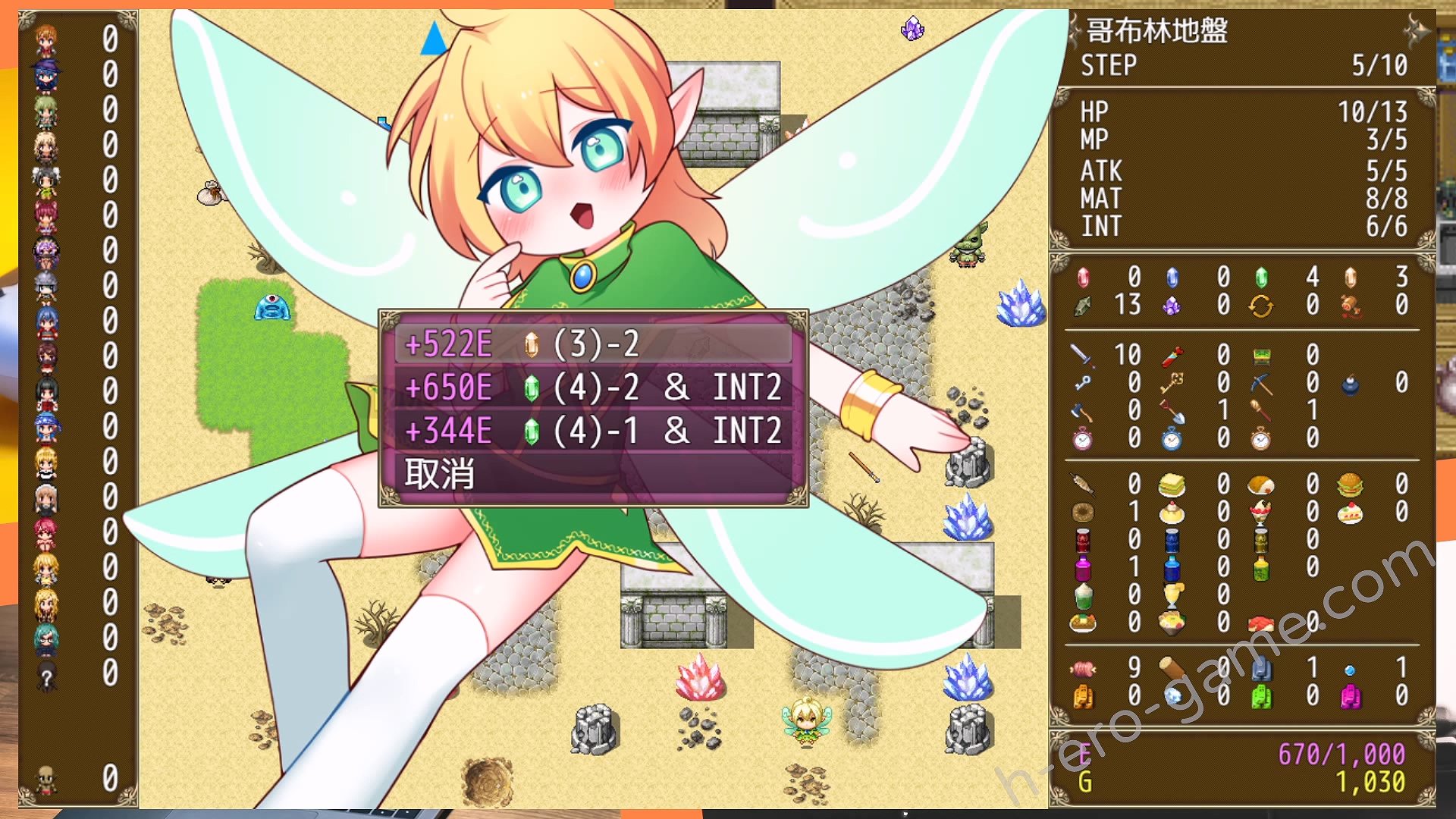 像是在第一到第五層的「哥布林地盤」的話,都是比較開放式而沒限制路線的地圖讓玩家收集屬性水晶。並且會擺放幾隻可以用屬性水晶兌換能源(Energy,用來提升能力值的)的精靈商人。