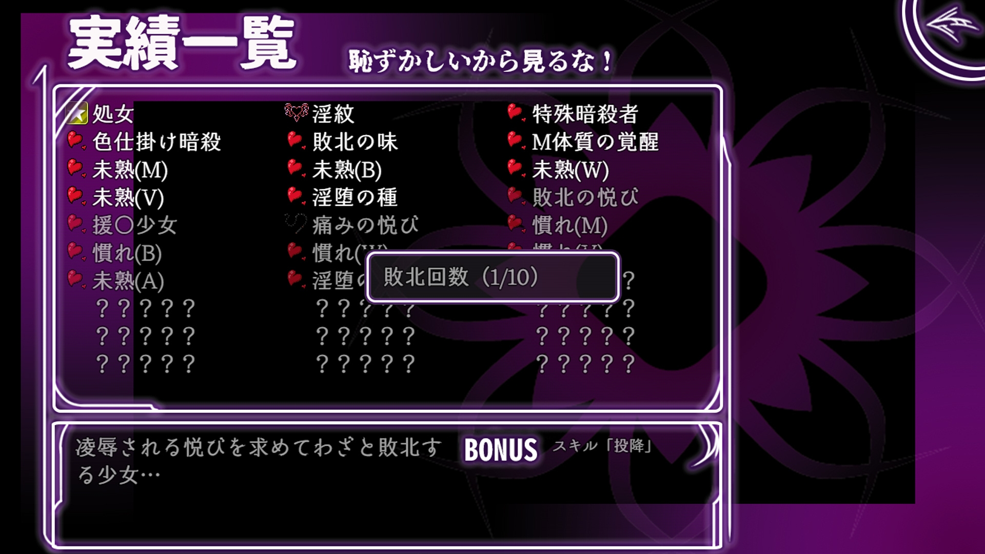 在淫殺者路線中要是持續戰敗或是讓任務失敗的話,女主的待遇會越來越糟糕。不能用中央區的公廁、澡堂,只能用貧民區男女混合的澡堂跟廁所。