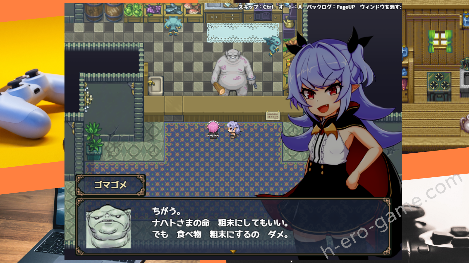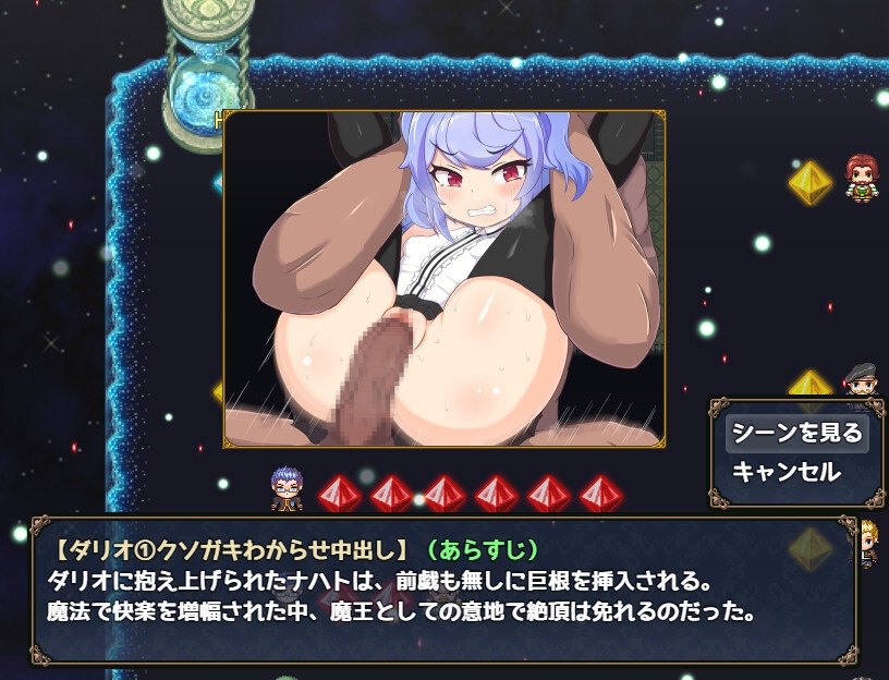主要流程就是在各處回收魔力,順便打倒在領土上搗亂的傢伙。雖然是類似ADV的形式,不過劇情的演出製作很用心,囂張活潑的魔王與她的屬下交流時有著各種逗趣的反應。