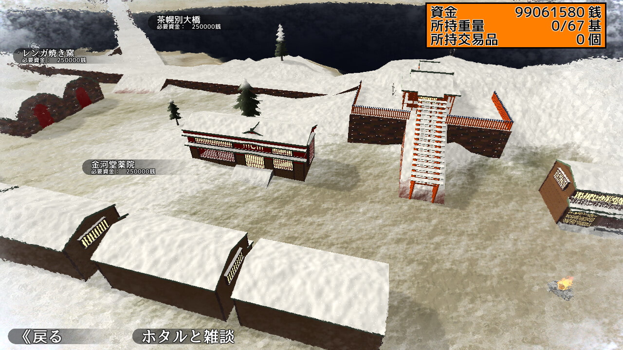 因此看著地圖上的營火標示,由這個營火走到下一個營火,慢慢往目的地前進。在抵達茶幌別之後,那裏的稻荷螢雪說要讓有著連接東、西蝦夷島這個優勢的茶幌別成為一個大城市,而你要用你經商賺到的錢協助她蓋廟搭橋。