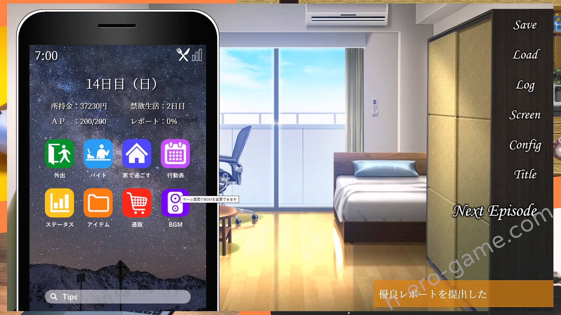 除了火、土兩日早上倒垃圾之外無法遇到女主,通訊軟體被無視,並且每日增加三點貞操。