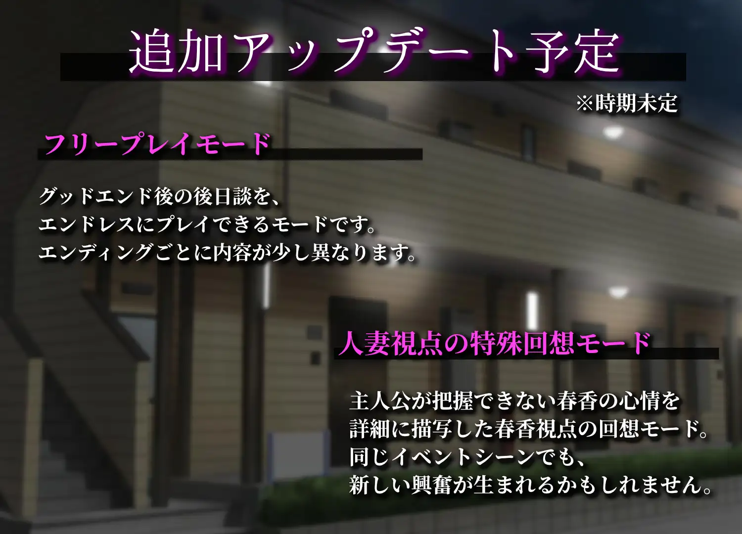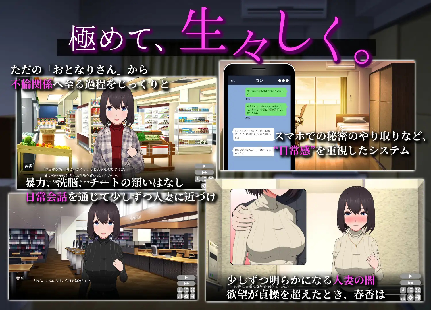 本作是一款戀愛養成模擬遊戲,男主要在完成大學課業的同時攻略住在隔壁的人妻。