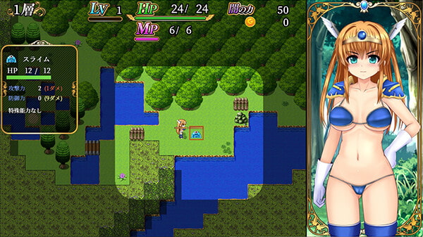 遊戲部分是不思議迷宮式的RPG,就是我方行動一次,敵方也行動一次,有時要空揮等怪走過來可以多打一次這種。當然也有各種卷軸、魔杖、藥劑、未鑑定裝備等等,雖然機率不高,不過也有詛咒的裝備,像是史萊姆劍、詛咒的內衣等等會讓你無法裝備其他裝備。還要注意的是卷軸要用讀的,魔杖要用揮的,但是藥水要看效果決定要丟出去還是喝掉,如果是喝了混亂藥水就是自己混亂。再來就是不思議迷宮的定番,離開迷宮之後任何道具跟詛咒裝備都會消失。不過本作的目標是要練到九十九級,所以等級不會重置就是了。