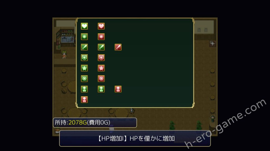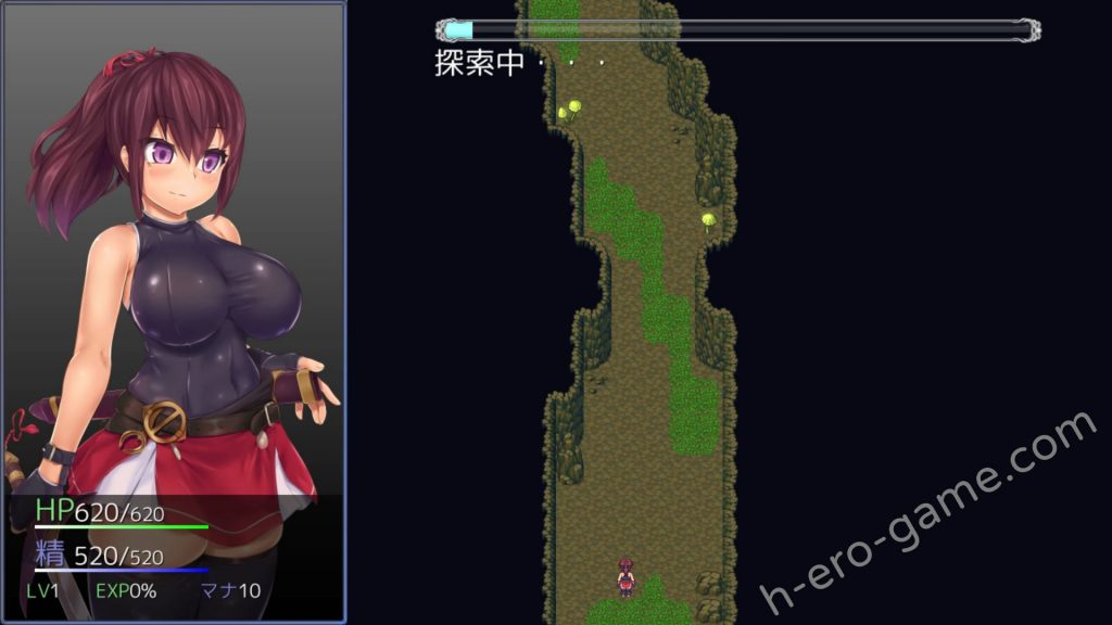 而且還有食物的設定,每場戰鬥都會消耗食物,沒有食物的話戰鬥時會有減益。所以也不能跟一般魔塔一樣,點到能無傷打某種怪之後就把那種怪全清了,不然食物不夠用。雖然有些地城裡也有可以用瑪娜換食物的商人,不過那就得要精算看看划不划算了。符合魔塔遊戲有限資源跟固定配置的部分,但整體要考慮的要素比純魔塔遊戲要多不少,製作社團之前的「淫層の洞窟」比較像是純魔塔。