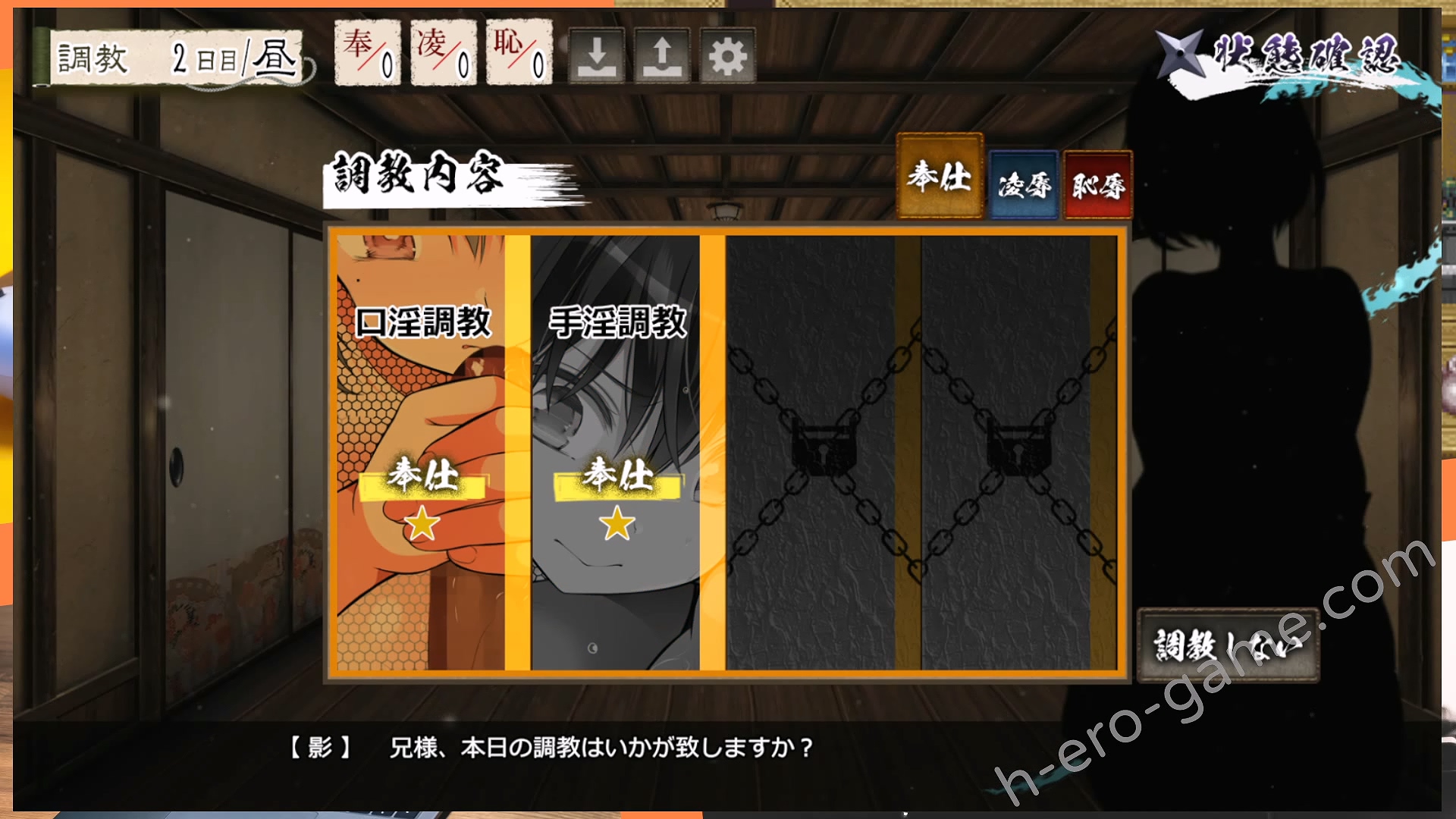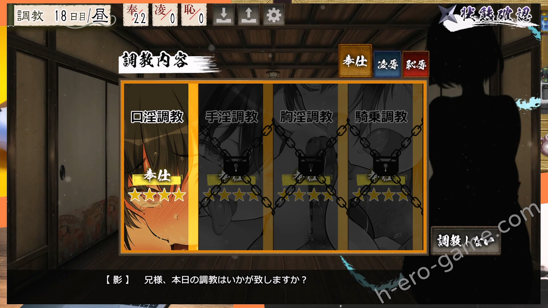遊戲分為白天和晚上兩個時間段。白天的時間主要是進行調教。由奉仕、凌辱、恥辱這三種調教方針之中挑選可用的調教場景之後調教。