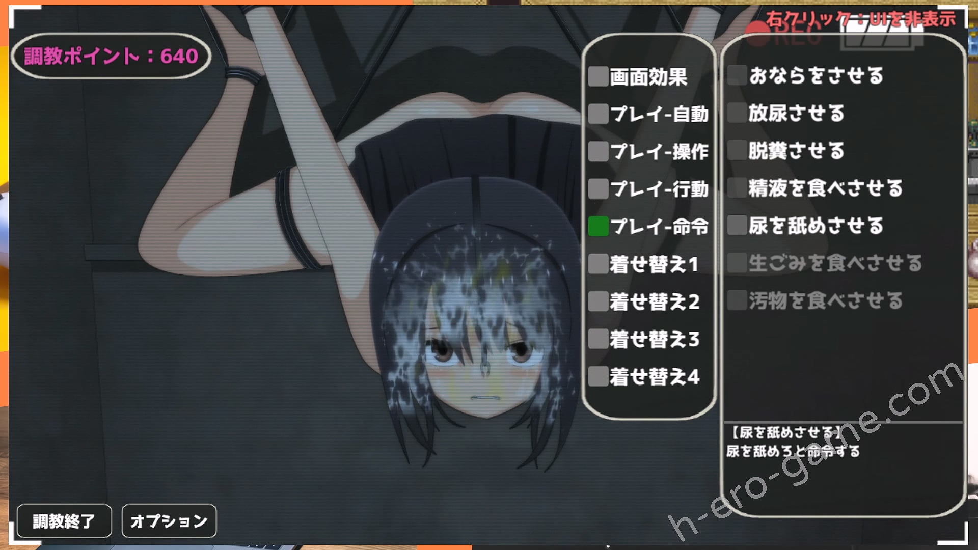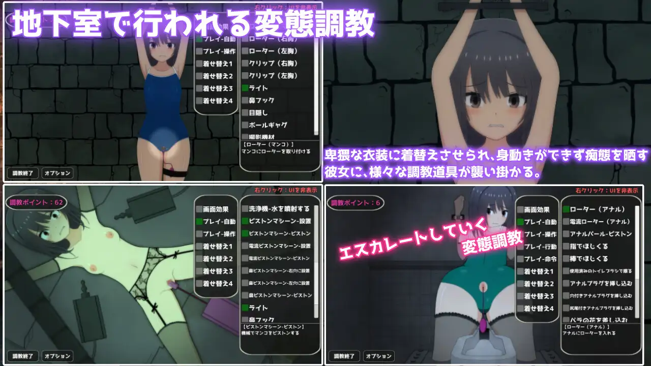 自動就是將跳蛋、夾子等道具固定在女主身上。而命令就是要女主做出某些行為,例如要她放尿、脫糞、自慰等等。