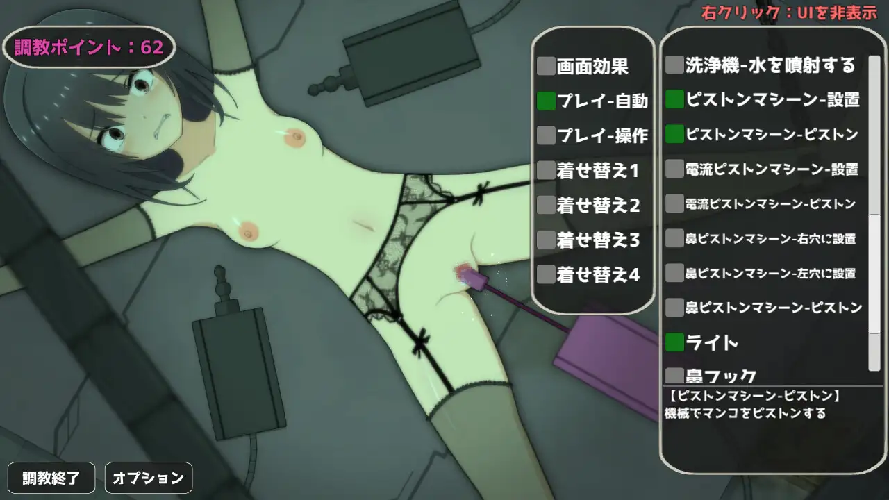 另外,本作完全沒有本番,而是專注於各種特殊Play,特別是電擊跟污物類的。比較特別的是在第二個體位之後,女主開始會長出腋毛跟陰毛,然後可以拔毛去賣,看起來有點痛。