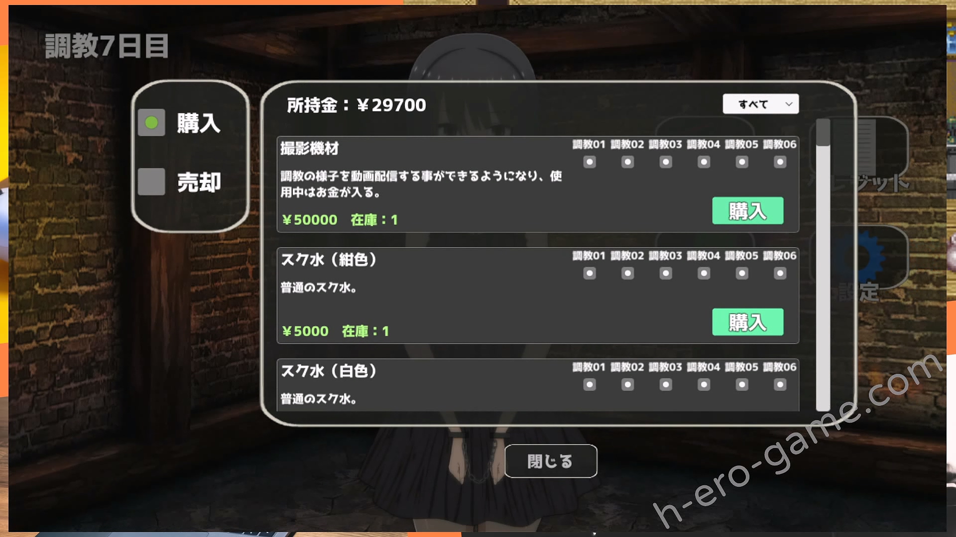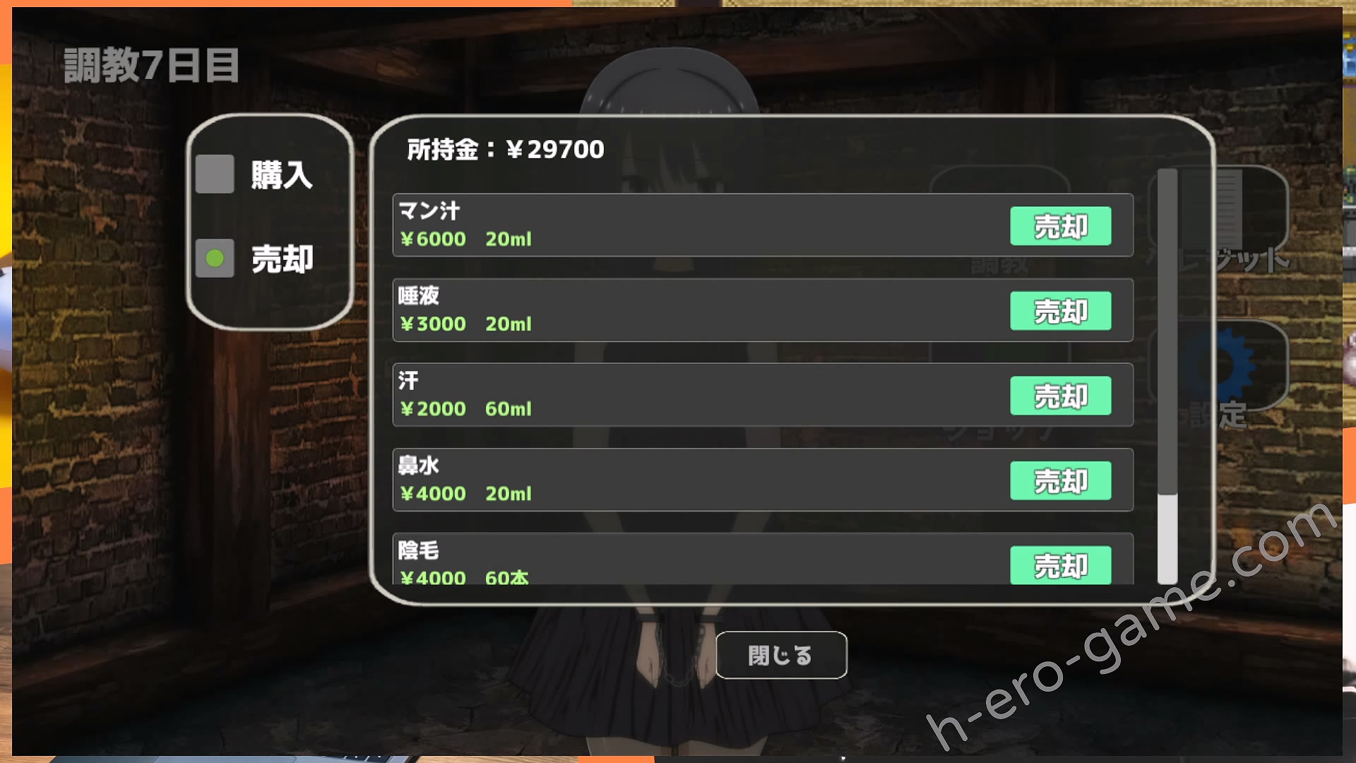 在調教之中會獲得各種女主的體液、體毛甚至是排泄物等物品,這些物品都可以在商店販賣,並利用這些資金購買新的調教道具以及可以替換的衣裝。