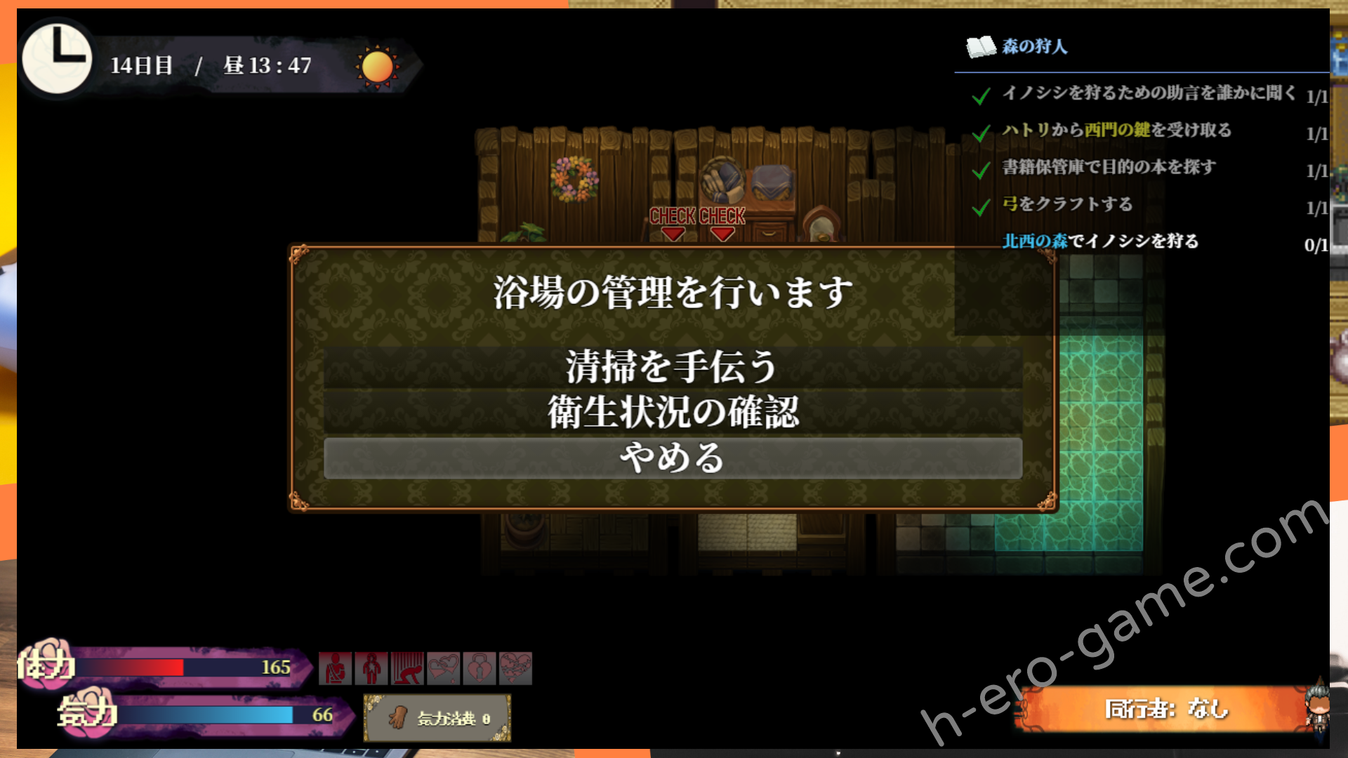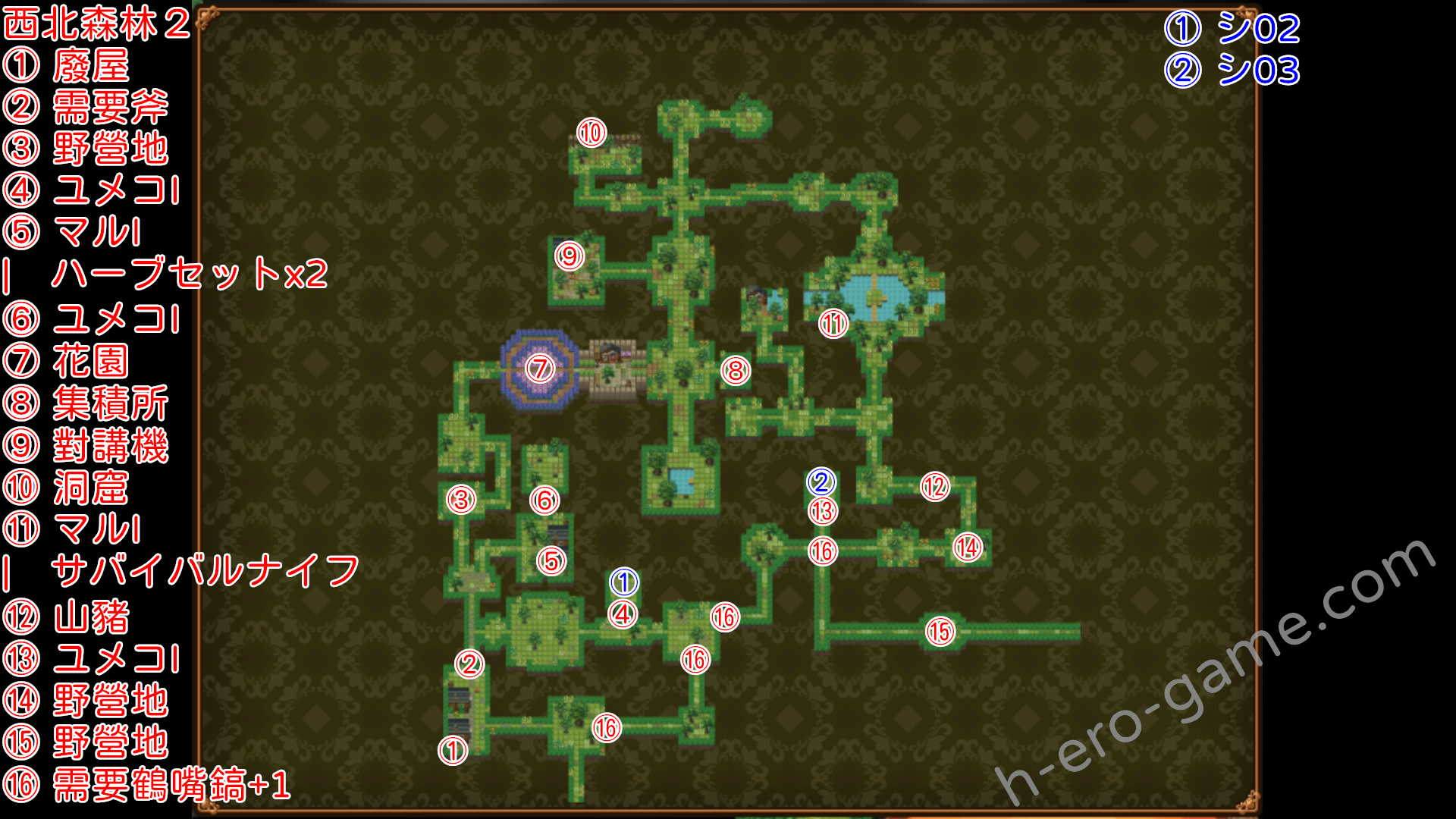 | 森の狩人 | 散らばりしレグホーンズ1 在西北森林2的湖與トウゴ對話 | 跟コウシ對話,跟ハトリ對話拿到西門の鍵,打開西北森林1西邊的門 在書籍保管庫調查,製作弓,殺山豬,與トウゴ報告 |