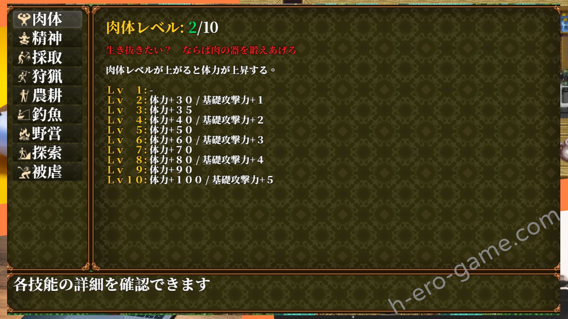 由於男主就是村落中的萬金油,所以他的技能相當全面。基礎身體數值的肉體與精神,還有漁獵農林等各式的技能,竟然連被虐都獨自有個技能。