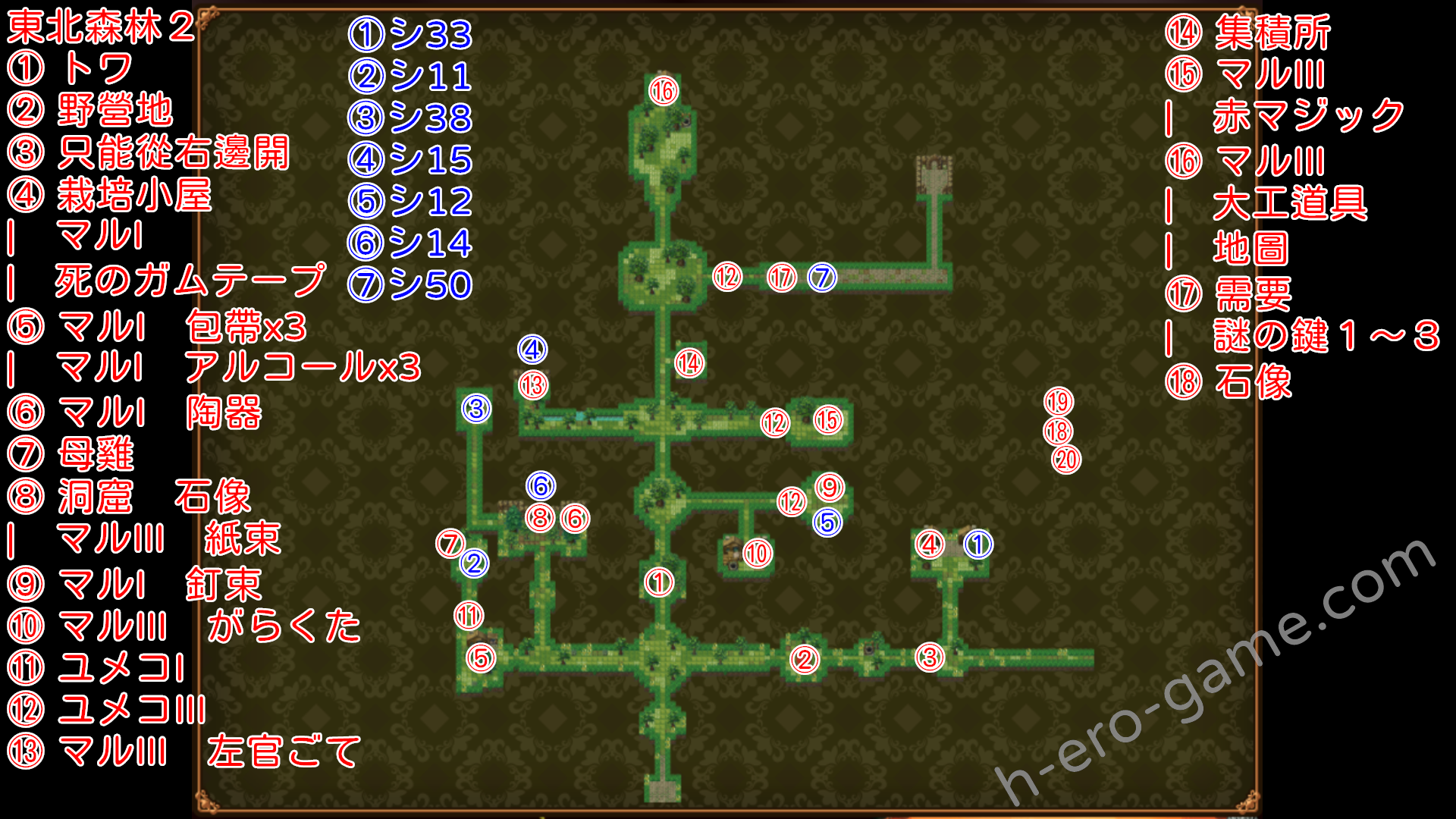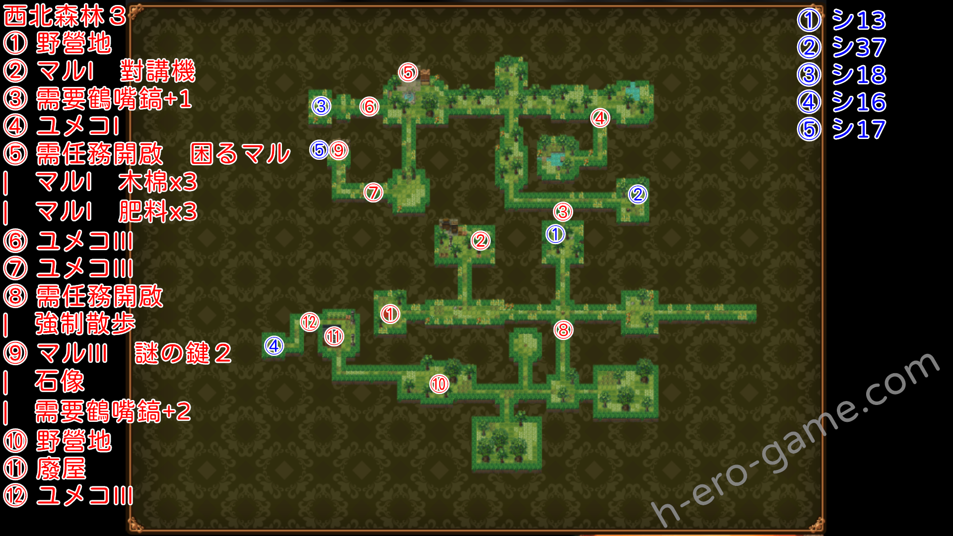 | 謎の少女1 | 西北森林1與コウシ對話 | 獨自前往西北森林4,位置在入口往北,之後進入廢屋發生事件,廢屋中可獲得門の鍵2 最後跟コウシ回報 |