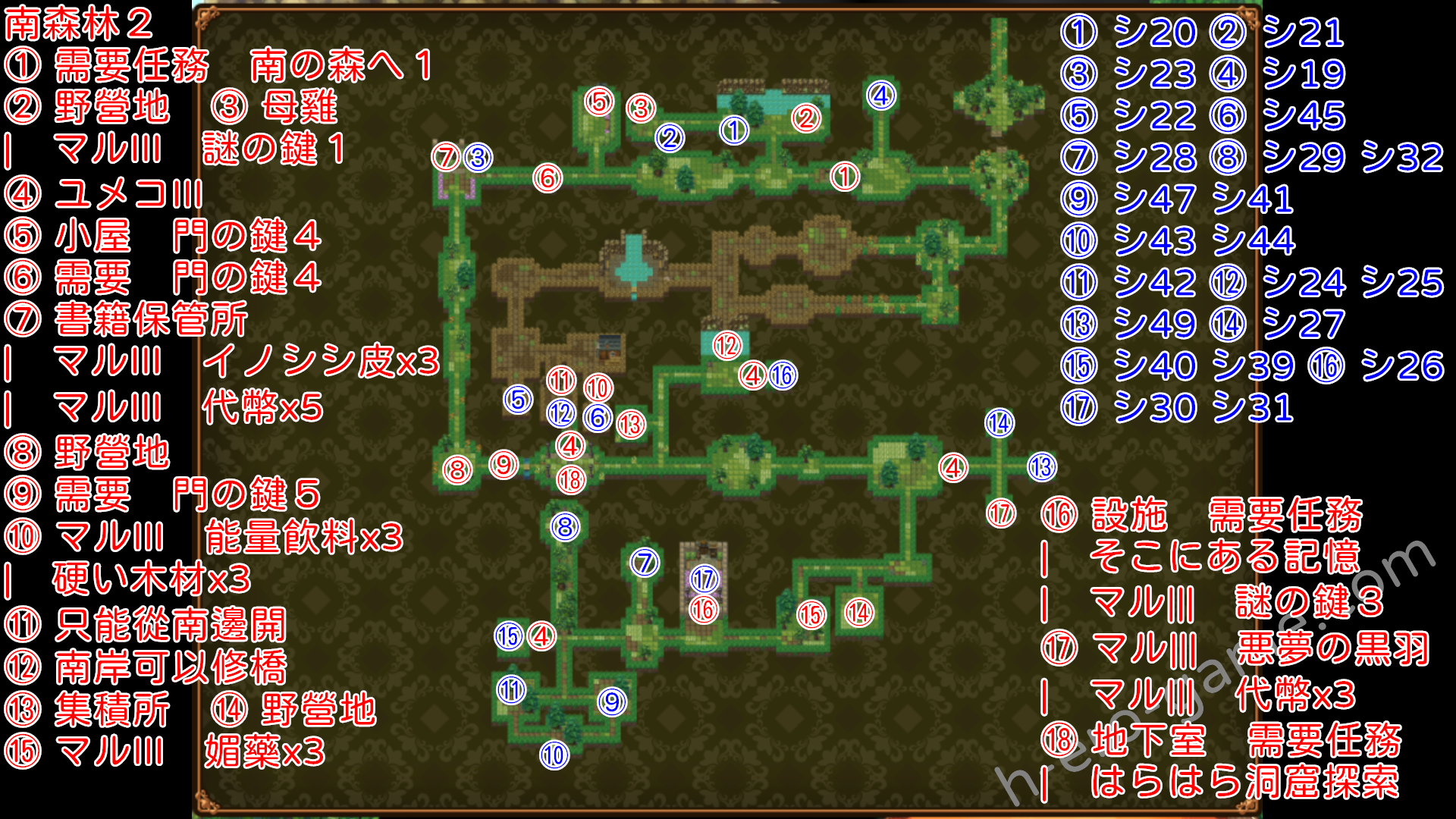 | そこにある記憶 | 揭示板 やすらぎの場所 | 跟トウゴ說話,帶トウゴ去南森林2的地下室,再帶到南森林2的設施 左下房間拿設施門の鍵,四個房間都檢查過回門口找トウゴ |