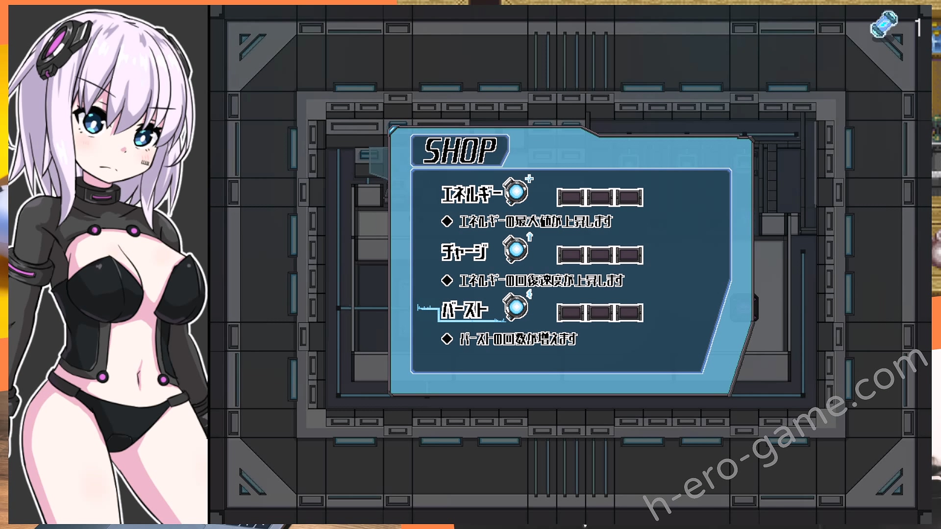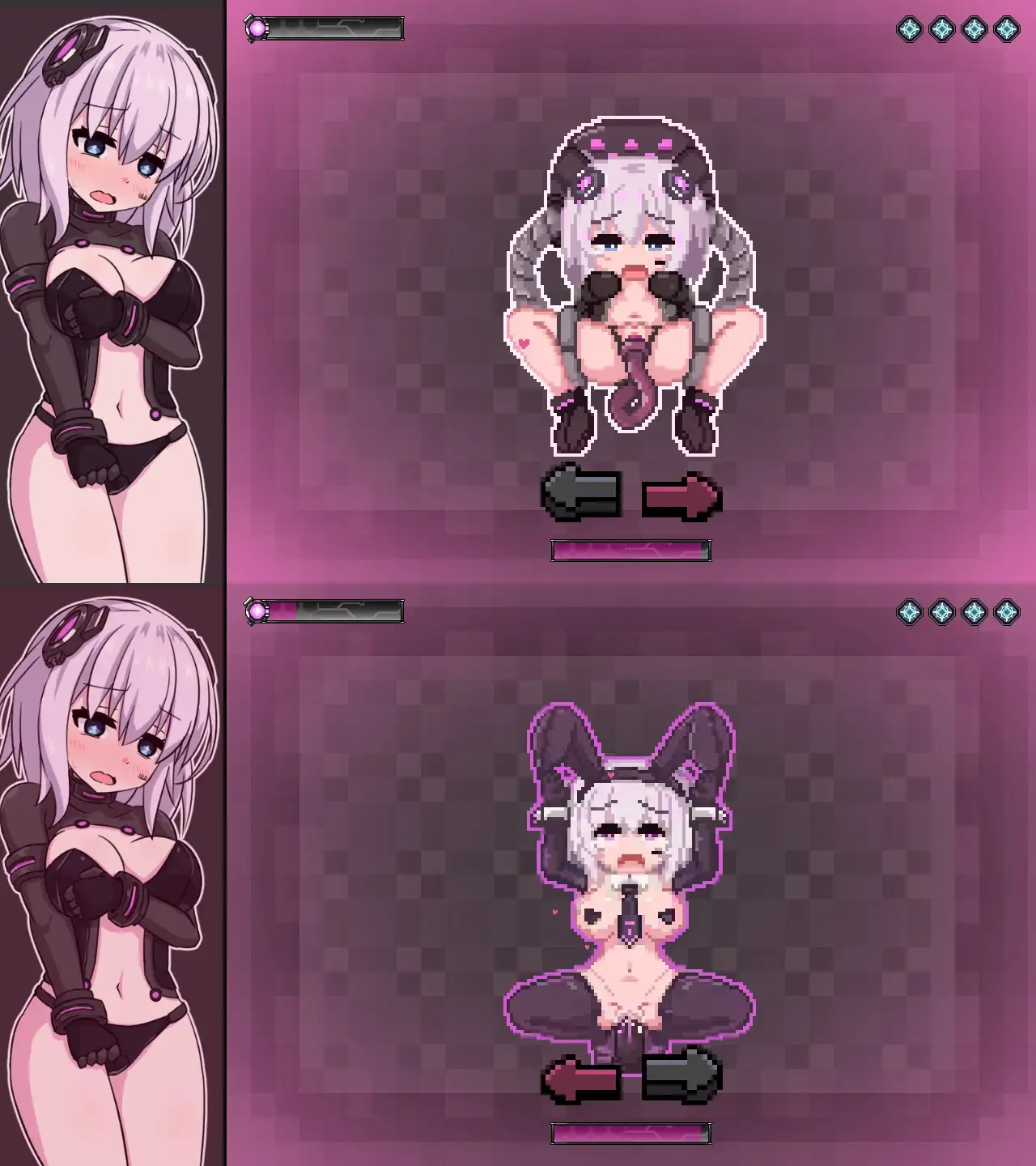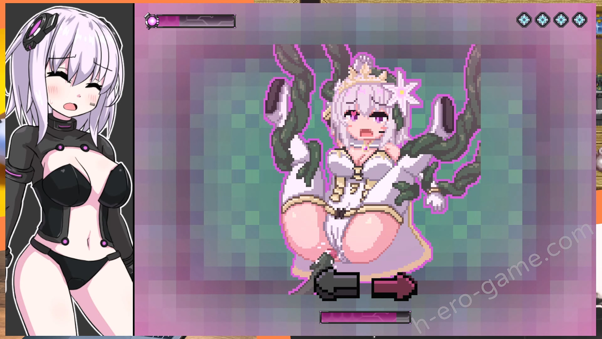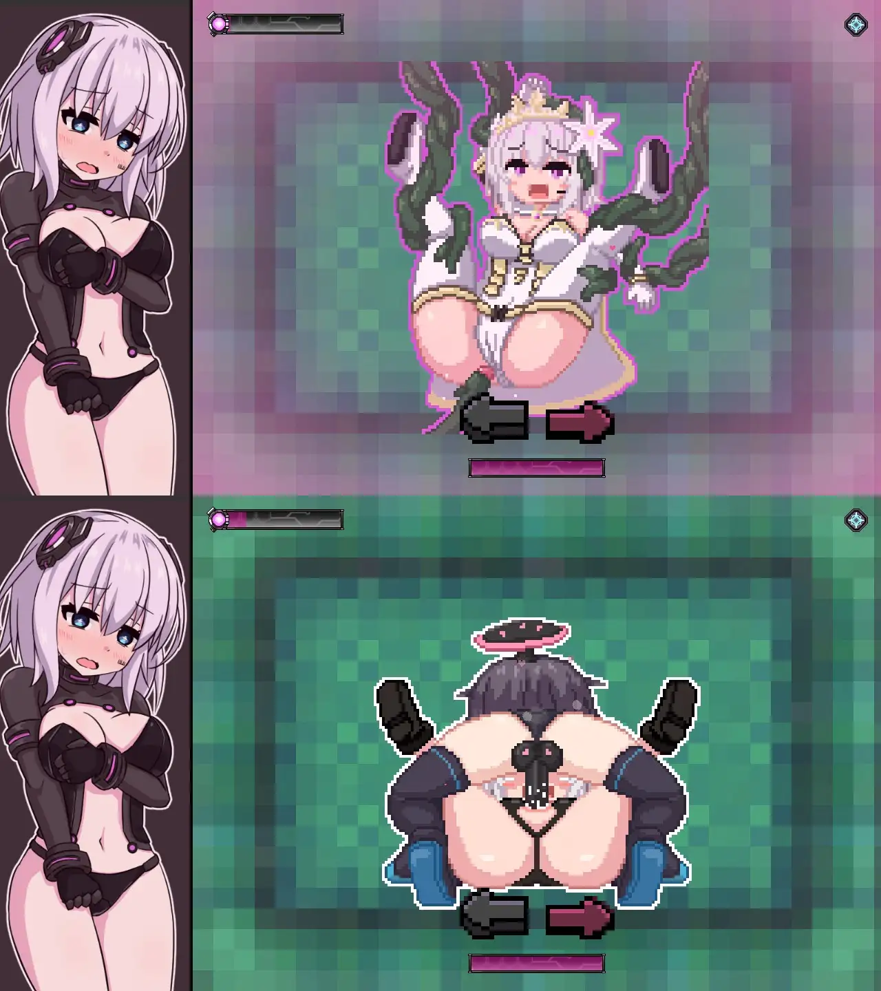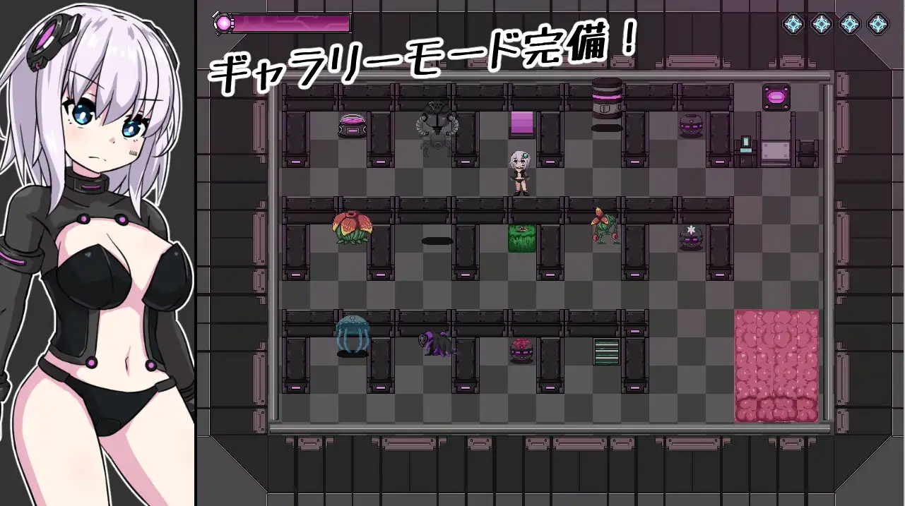 當能量低並且觸碰到敵人的攻擊時將觸發H場景,每種敵人都有一組動圖。雖然是點繪的風格,但被捕捉並且被侵犯的動圖相當精緻,女主相當可愛而且表情看起來很愉悅。