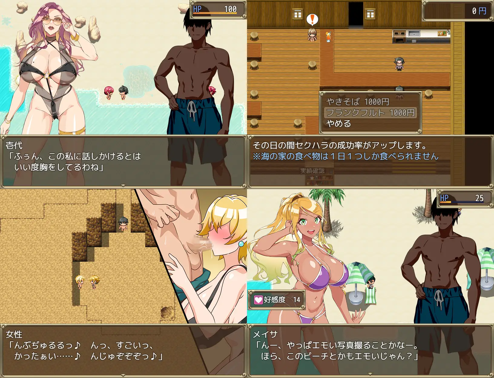 與女孩子們聊天可以增加好感度,買下增加好感的護身符並且在海之家吃過加好感的料理的話,一次對話大概可以增加十點左右。好感度在50、120、200、300時會有事件發生,屬性足夠就可以觸發H事件。