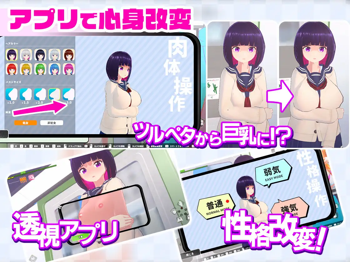 另外,在觸摸場景中每次觸碰都會增加點數,點數可以用來開啟各種催眠APP的新功能。像是改變個性這個功能,除了女主的台詞與反應會改變之外,同時也提高遊戲難度。
