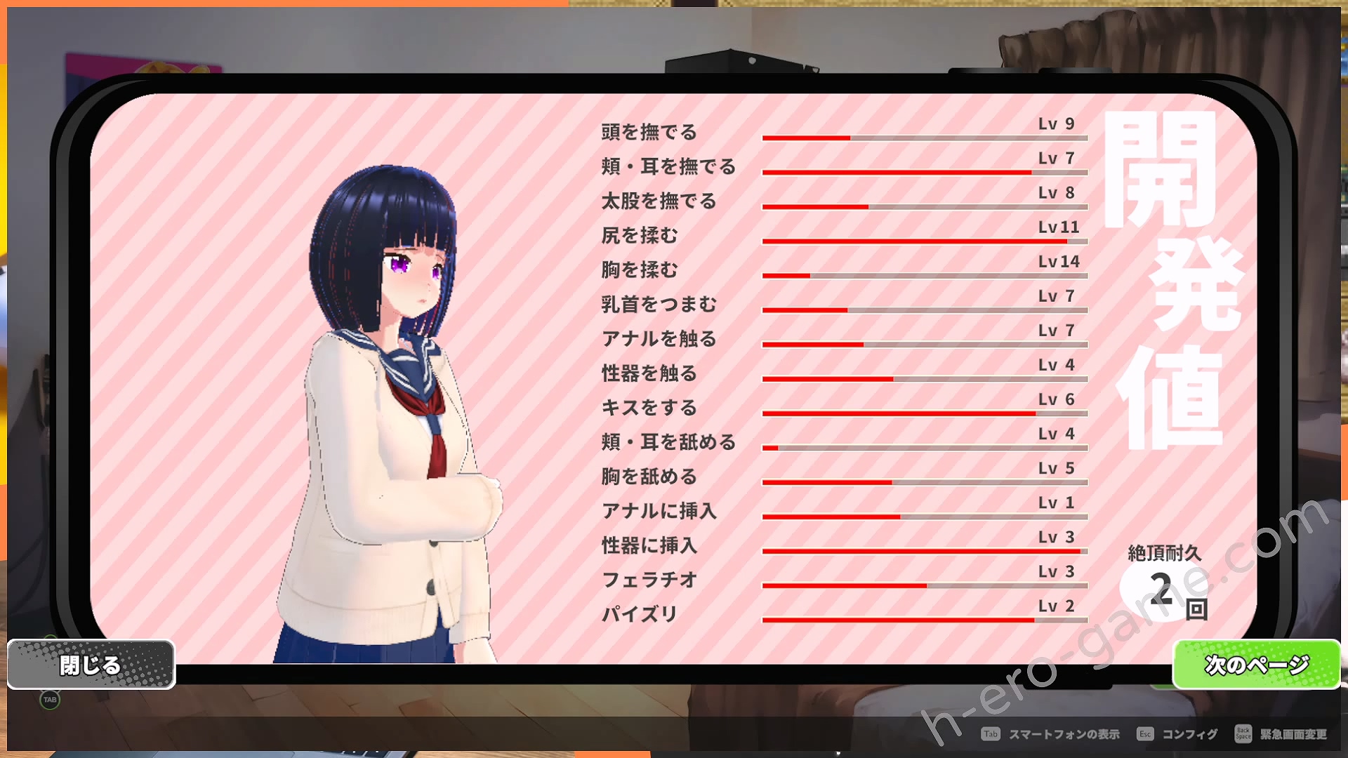 要注意的是開發度與觸摸的方式有也關係,例如用手摸耳朵跟用舌頭舔耳朵是不同的開發度。揉胸、捏乳頭、舔乳頭也都是不同的開發度。但道具的部分其實算是手或丁丁,像是用跳蛋碰胸部是加揉胸的開發度。