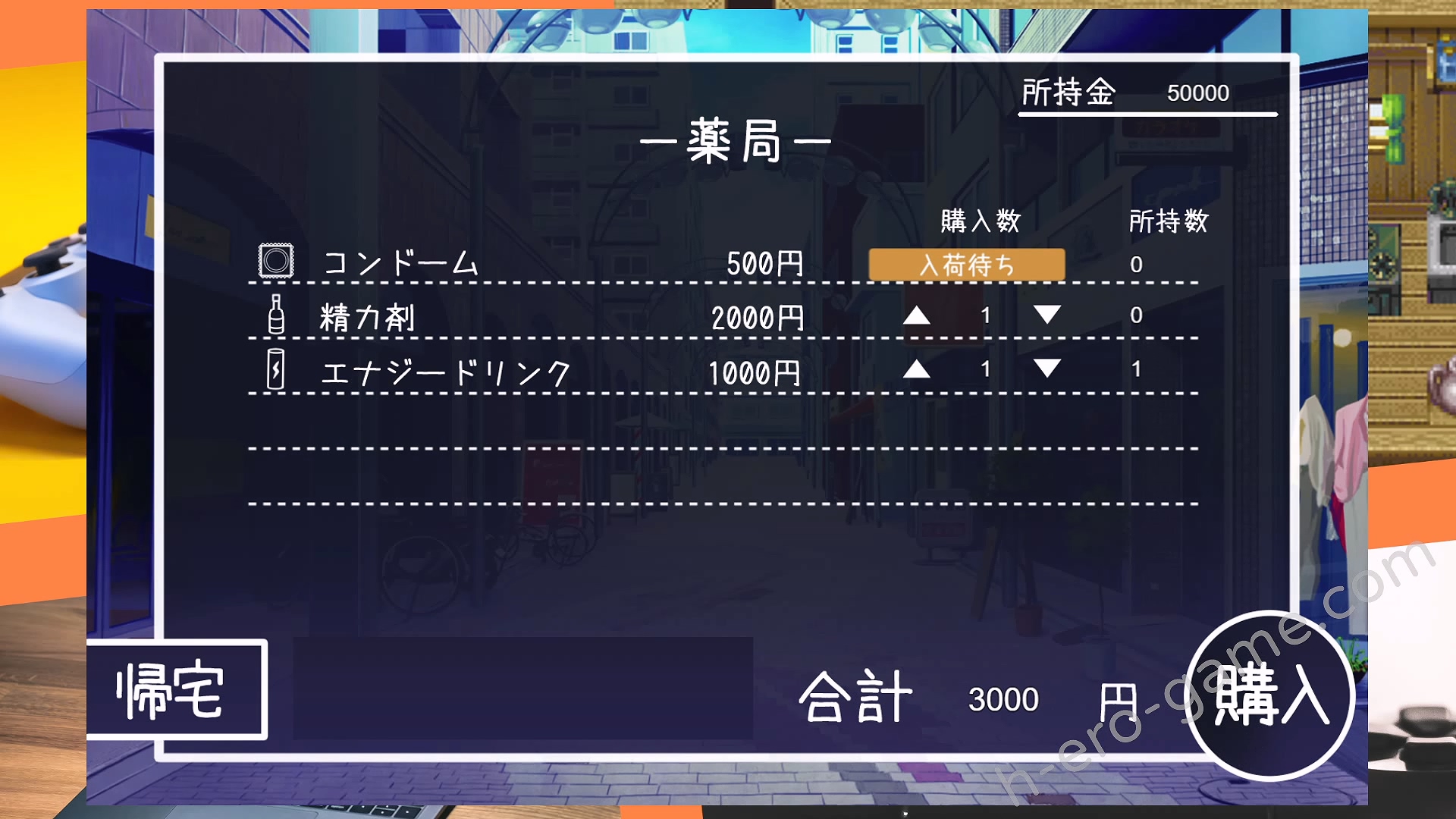 出門的指令可以選擇散步或是去購物,散步可以增加最大體力,而購物其實主要是去超市買晚餐,東西不會壞掉所以多買一些比較省事。另外要注意的是藥局跟情趣用品店都有賣保險套,但我玩的時候藥局的保險套永遠都是待進貨的狀態。