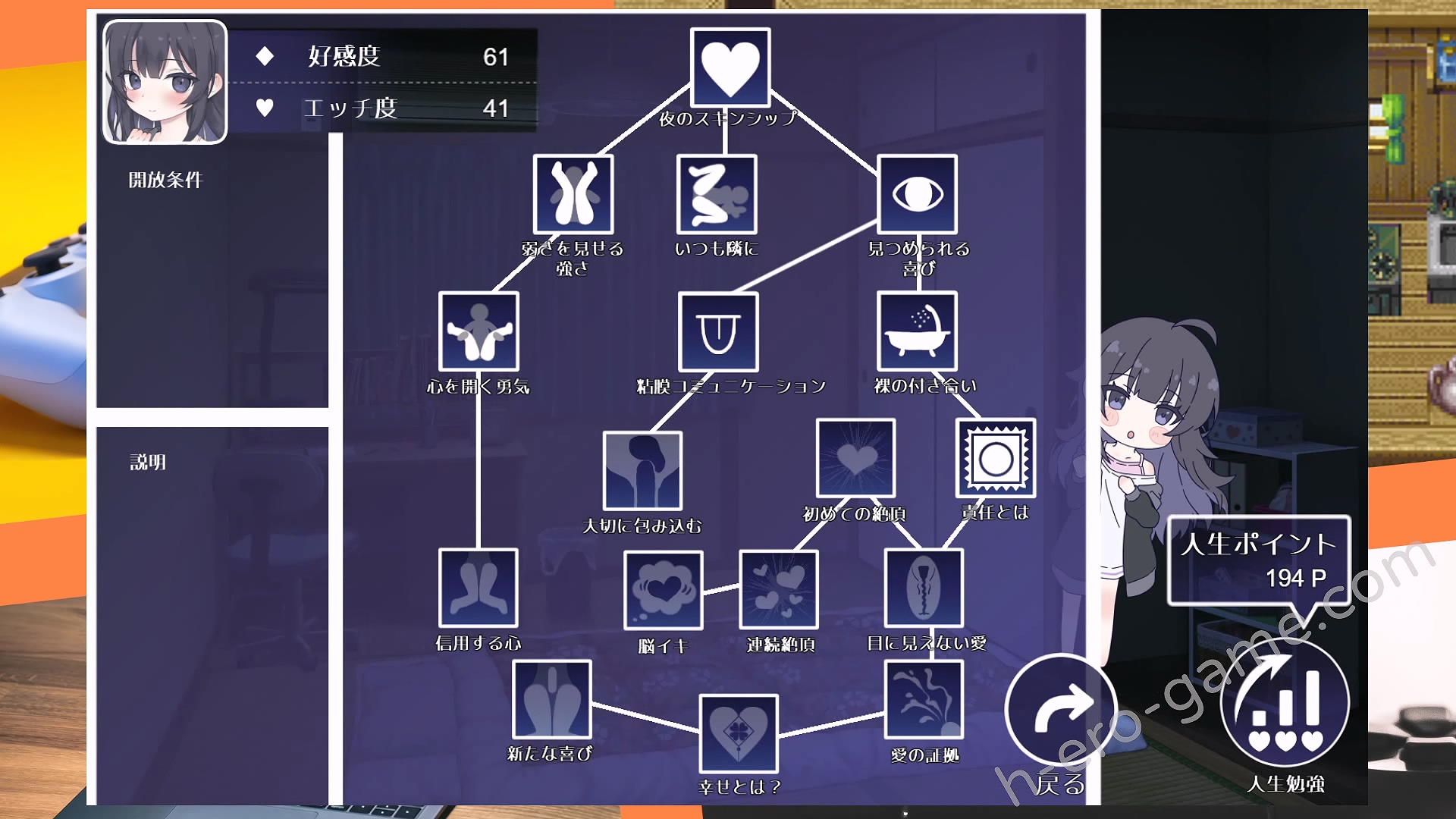 再來就是要用人生點數來開啟技能樹,其實就是解鎖各種互動以及體位,不過要注意技能樹上有部分的前置條件畫錯了。像「裸の付き合い」與「初めての絕頂」中間雖然沒有畫線,但其實可以點「初めての絕頂」。