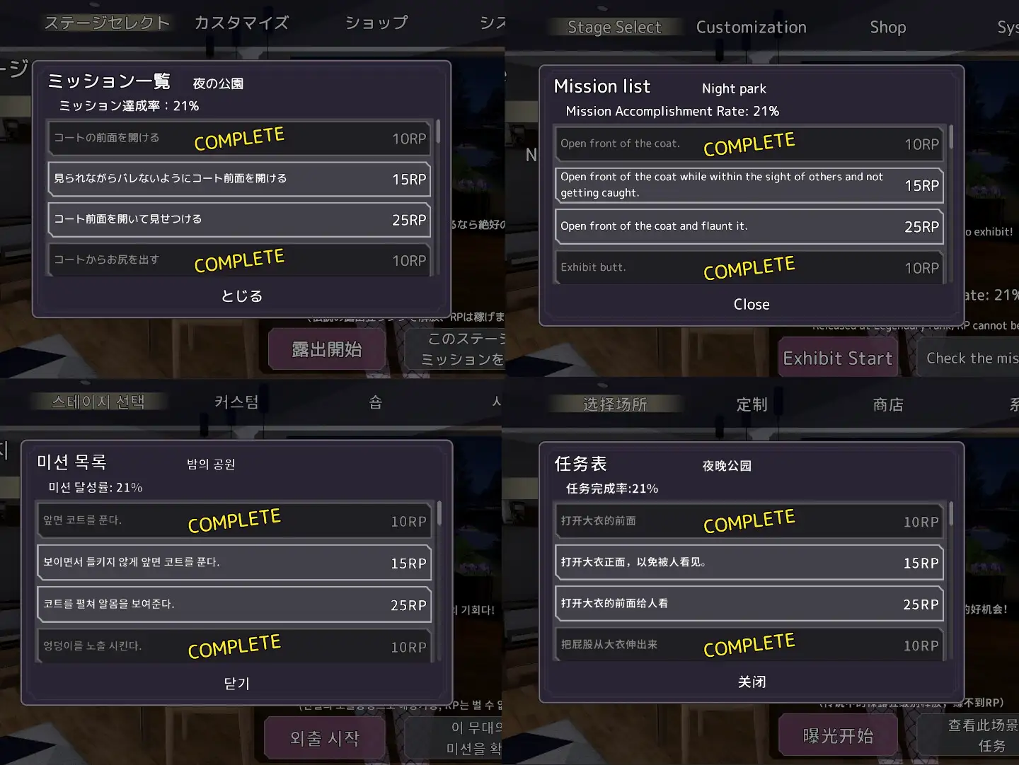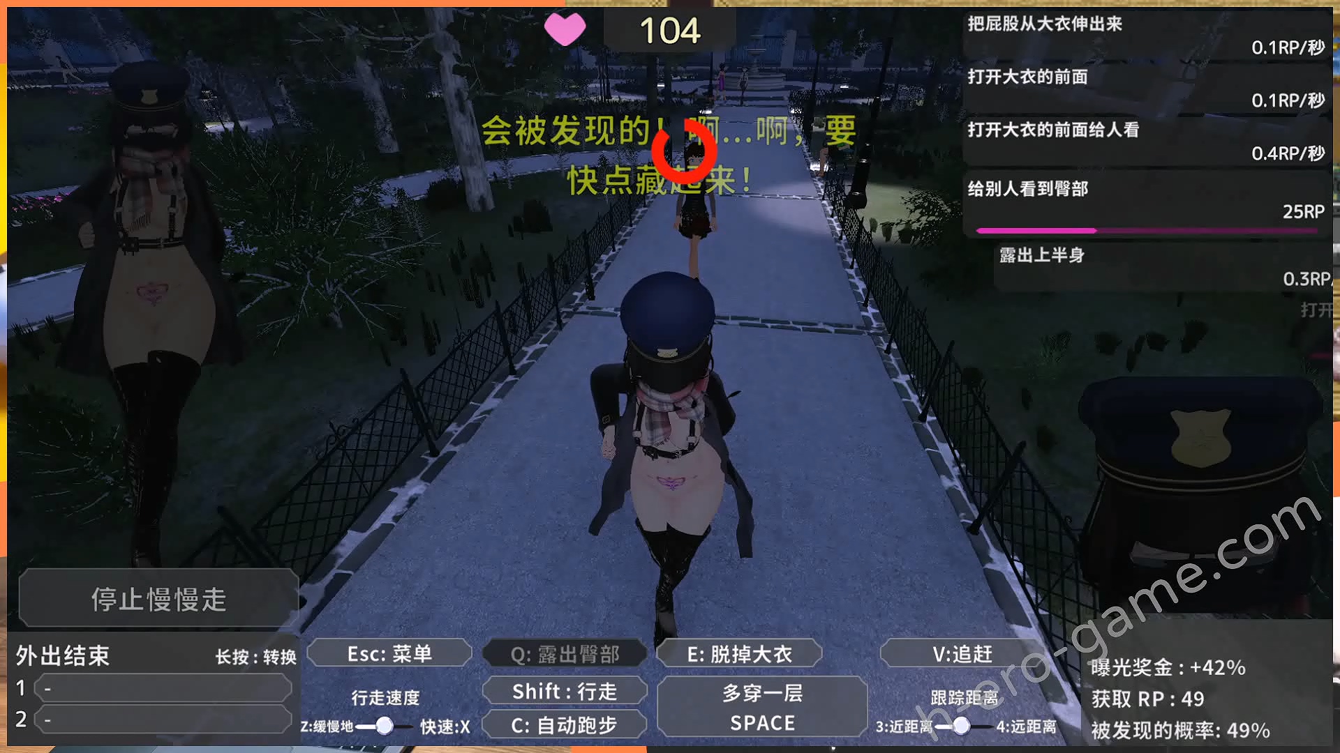 大致上是要操作大衣裡頭什麼都沒穿的女主在地圖之中完成各種任務獲得曝光點數,像是打開大衣、在燈光之下露出、在他人面前露出等等的。