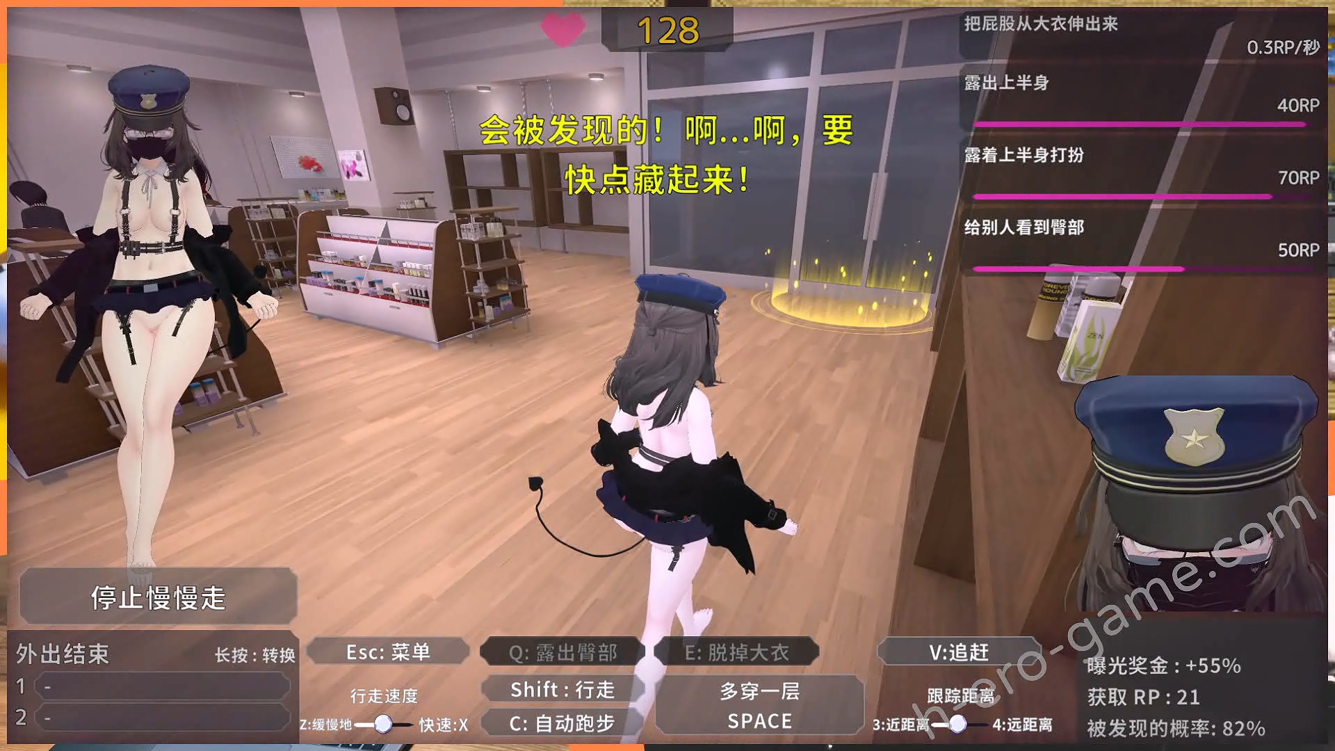 在地圖中露出被NPC看到會提升NPC的警戒值,沒有即時把衣服穿回來的話就遊戲失敗,所以在進行「在他人面前露出」類的任務得特別小心,要在對方的警戒還沒滿之前累積曝光時間並且即時把衣服穿起來。不過其實失敗了也沒有什麼關係,只是這次進入地圖達成的任務跟賺到的曝光點數都不算而已。