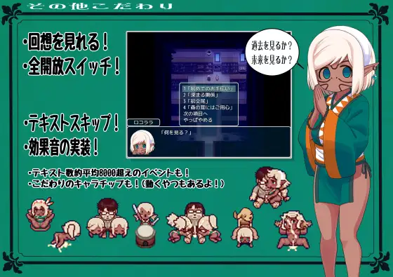 女主角一開始對性愛沒有相關知識,所以是以無知性愛開始。但本身就很悶騷的女主角很快就深陷其中。而村人們不論歲數都是蘿莉體型,所以有對性愛沒經驗但很有興趣的真蘿莉,也有身經百戰的合法蘿莉。