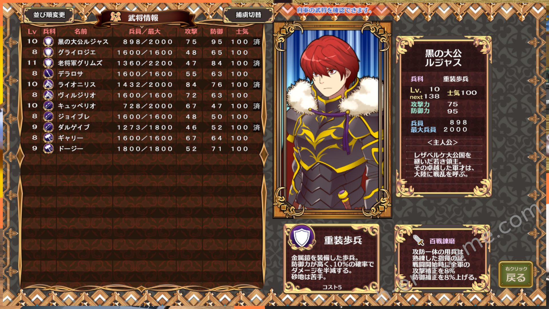 雖然說每個角色都是有立繪(部分是AI生成)的獨特角色,但有些角色就是比別人獨特一點,例如男主的技能是可以提高全軍的攻擊補正與防禦補正。
