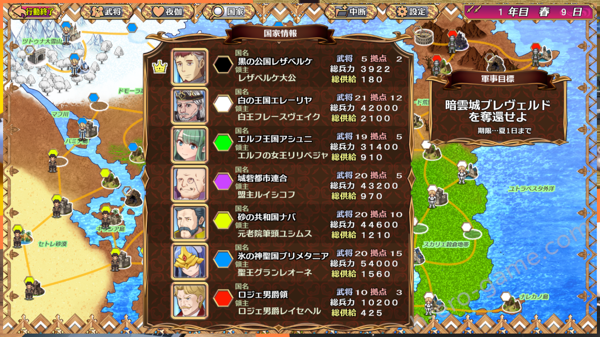 遊戲進行是要在指定的時間內達成軍事目標,像初期是要在夏一日之前奪回暗雲城。完成之後等待下一次的軍事目標出現,而這段時間就可以輕鬆的休息並在競技場進行訓練提升繳。