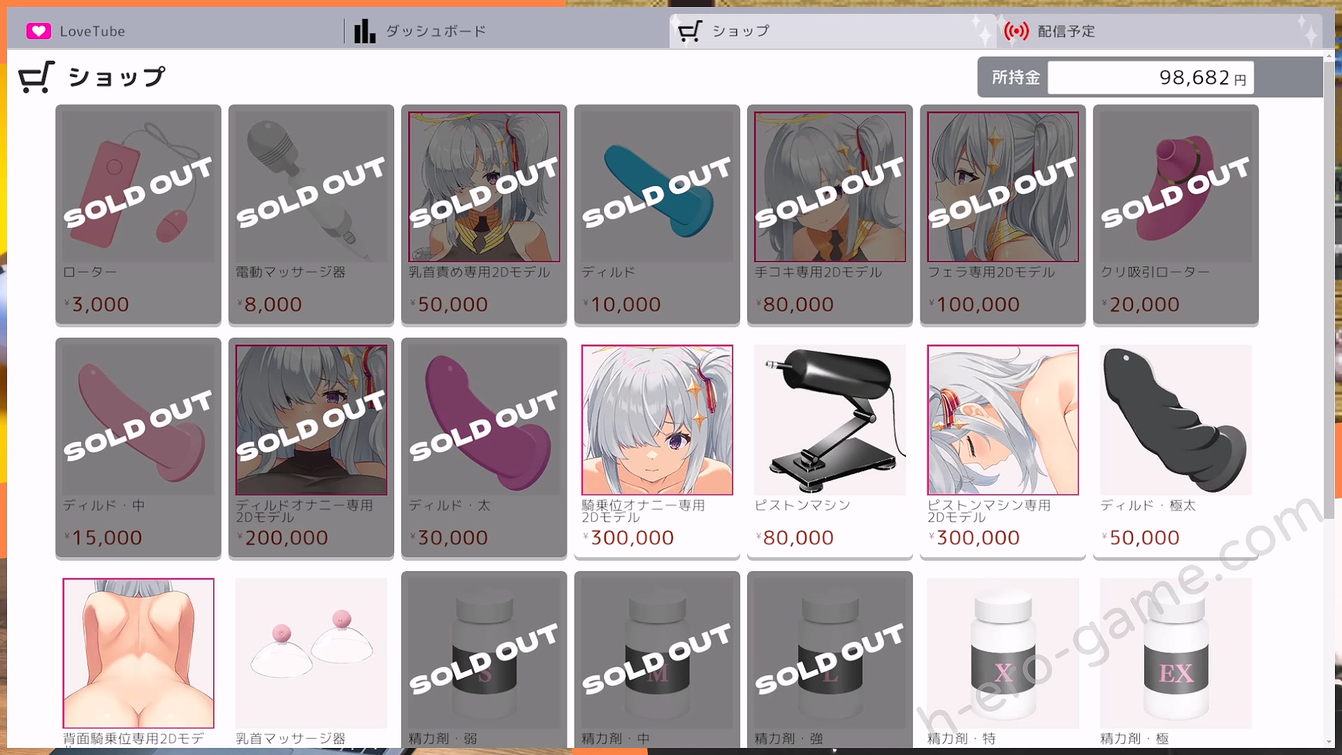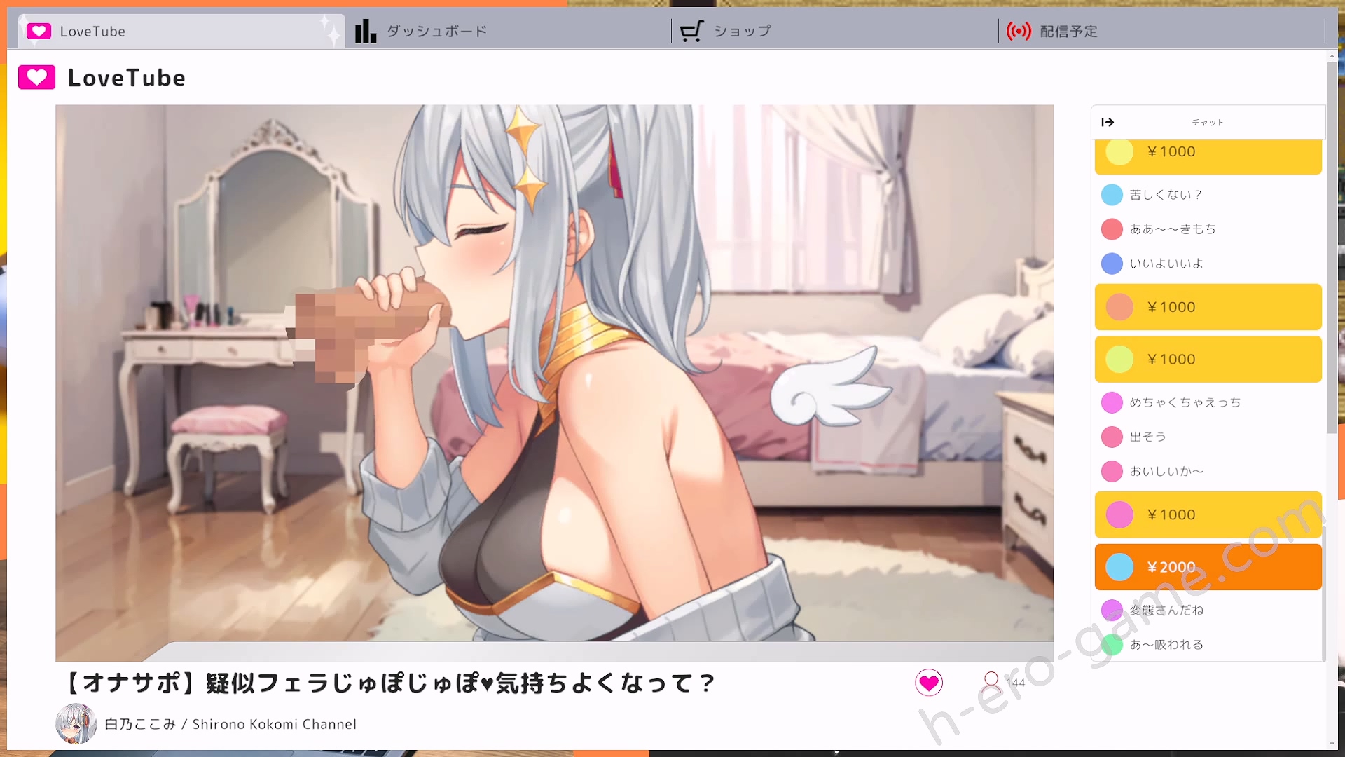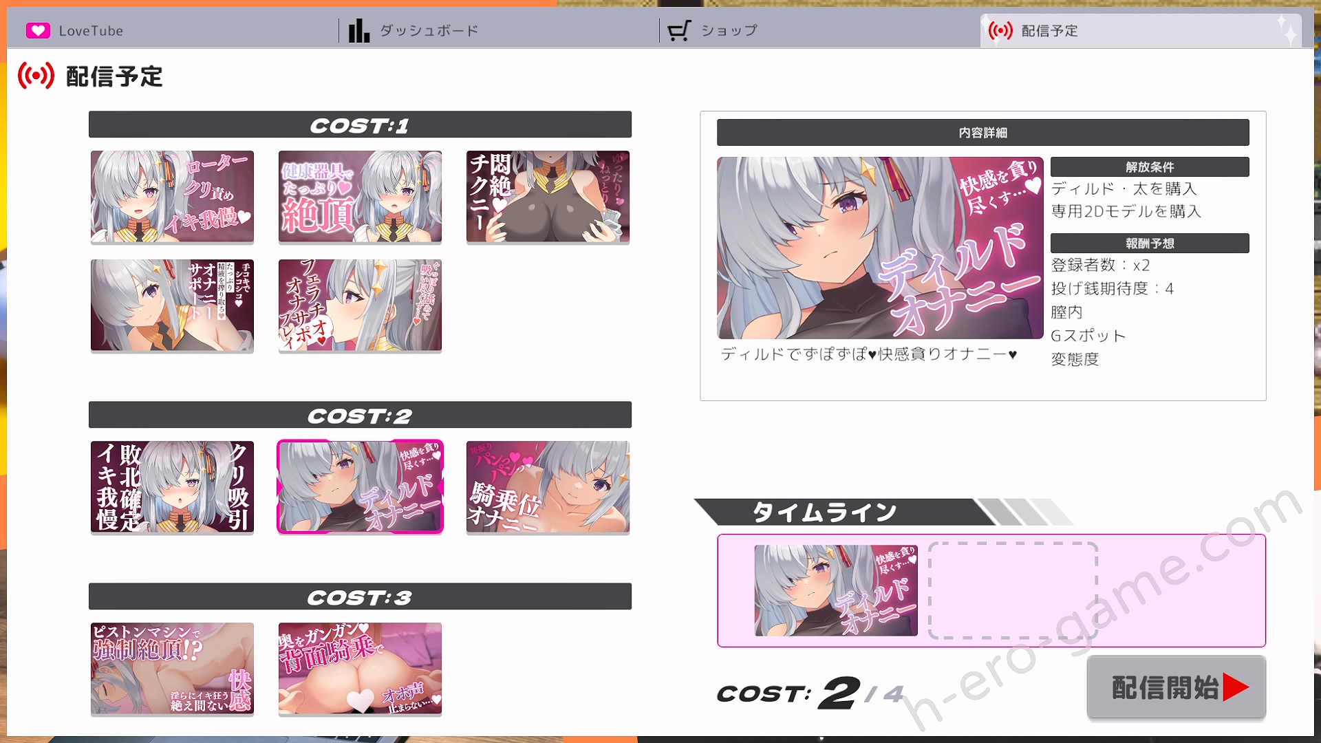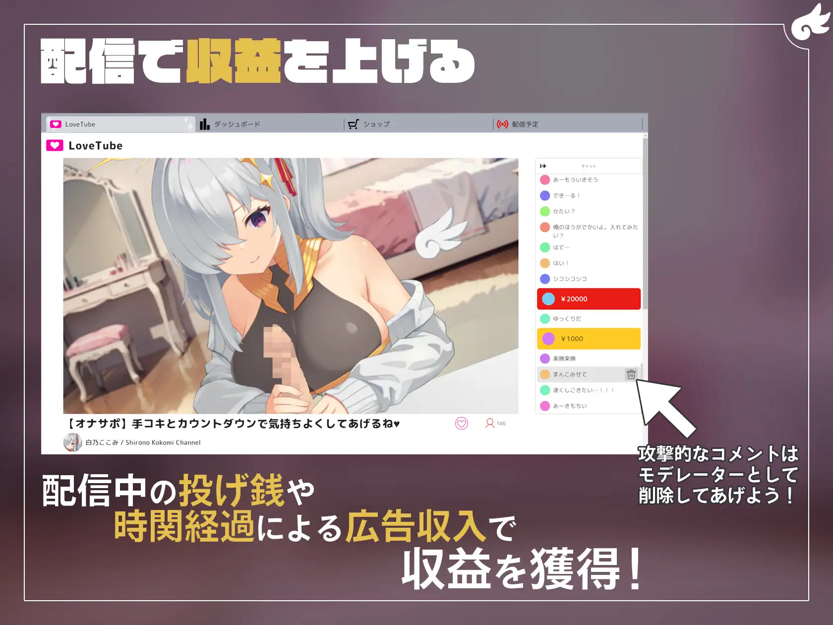 本作是一款直播模擬遊戲,主要就是從直播中獲得收益,購買自慰工具和各種動作的專用2D模組,然後不斷地進行新的直播。例如要買跳蛋才能進行跳蛋自慰直播,要有假陽具跟口交動作模組才能開口交直播。