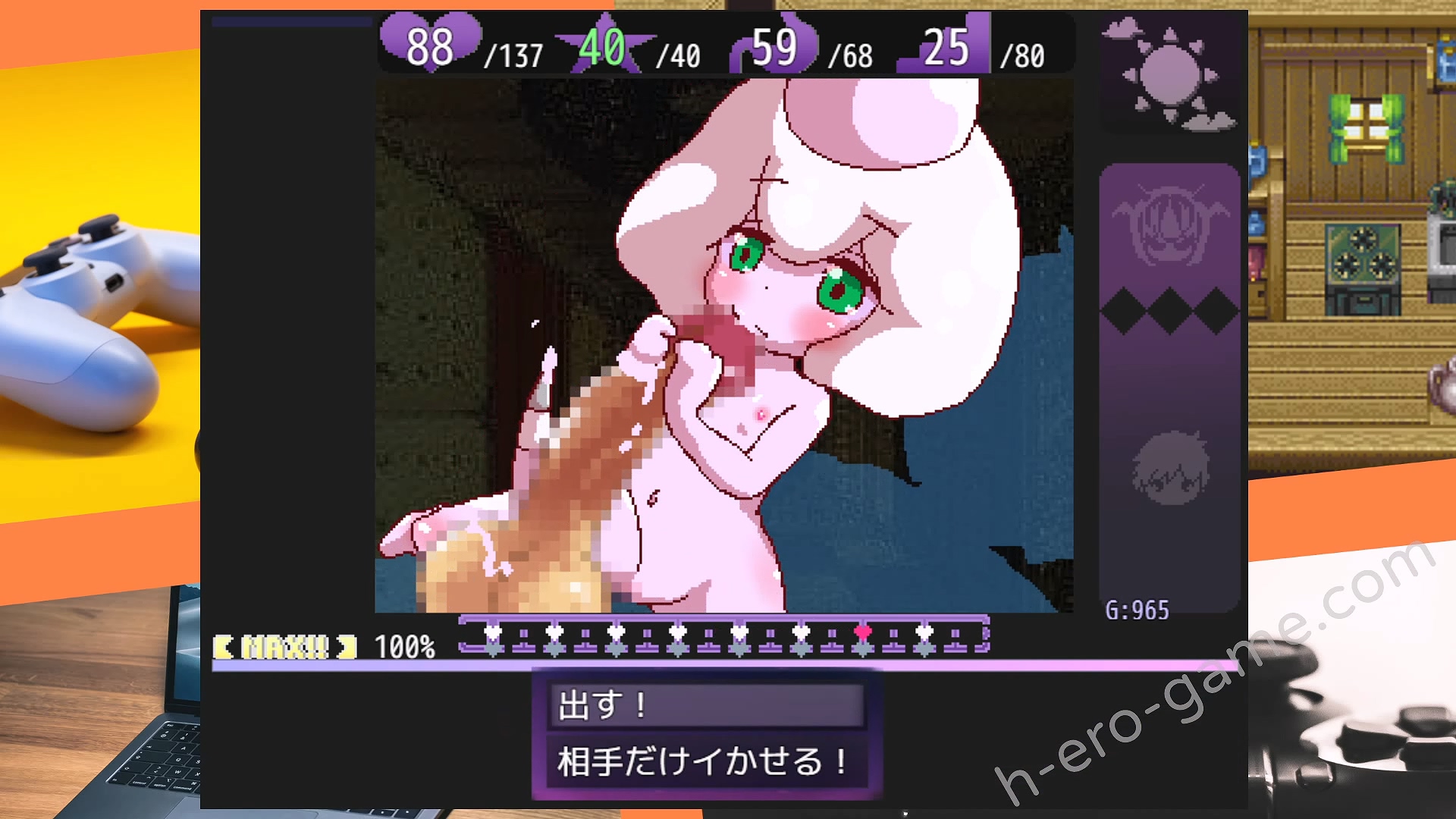 而畫面下方像是跳舞機的愛心符號則是魔物娘的計時條,魔物娘同樣要等計時條跑完才會進行一次的攻擊或使用技能。而ENEMY PM則是魔物娘的滿足度,這會在戰鬥中慢慢提升,並且在受到男主攻擊時大幅提升。