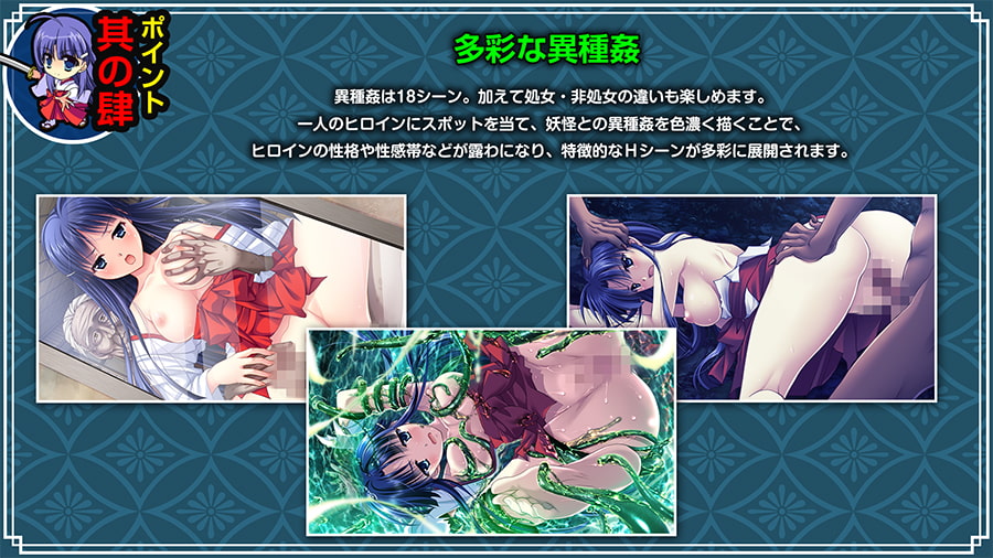 記得在「紅神樂」登場的時後因為男主的關係而失去大部分的力量,而這款的介紹上來看還是在退魔機關活動,所以背景應該是在紅神樂之前。是說既然被妖怪凌辱會有處女差分的話,絕對是在紅神樂之前就是了。