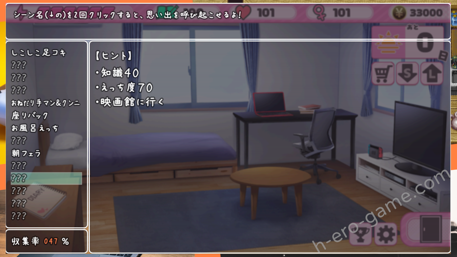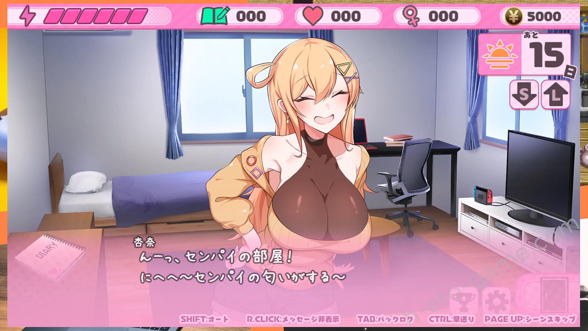 在房間中的主要行動有三種,在黑色桌子上讀書會提高學習,點電視玩遊戲會提高愛情,跟學妹觸摸互動則增加H度,不過觸摸只有夜的時段可以使用。