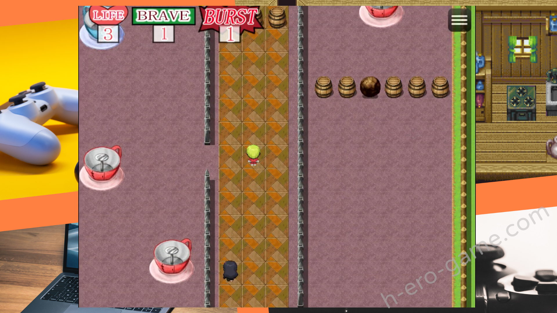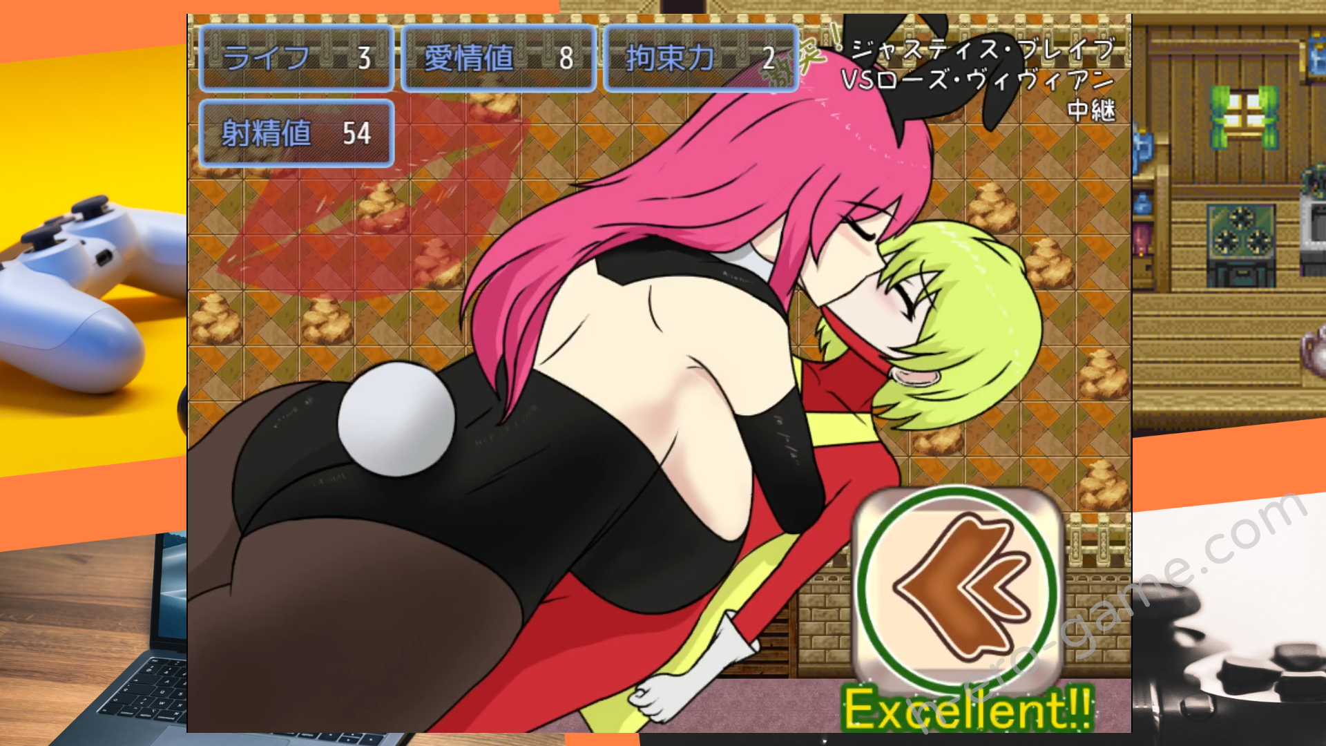 如果不滿足上述條件碰觸敵人會就被拘束,進入拘束動畫會累積射精值並進行QTE判定來掙脫,射精值滿100就會射精並減少一點體力,地圖上的藍球可以回復缺失的體力。
