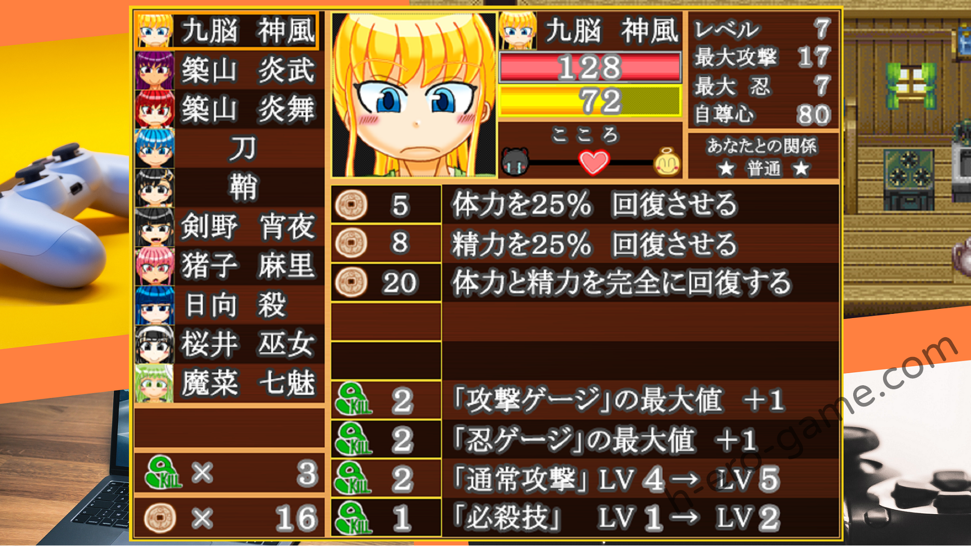 不同角色一次能提升的素質上限會不一樣,例如攻擊型角色通常可以把升級點全點在攻擊,防禦系的角色就只能點二點攻擊。可以升級的素質方面,友情與技能點解釋一下。