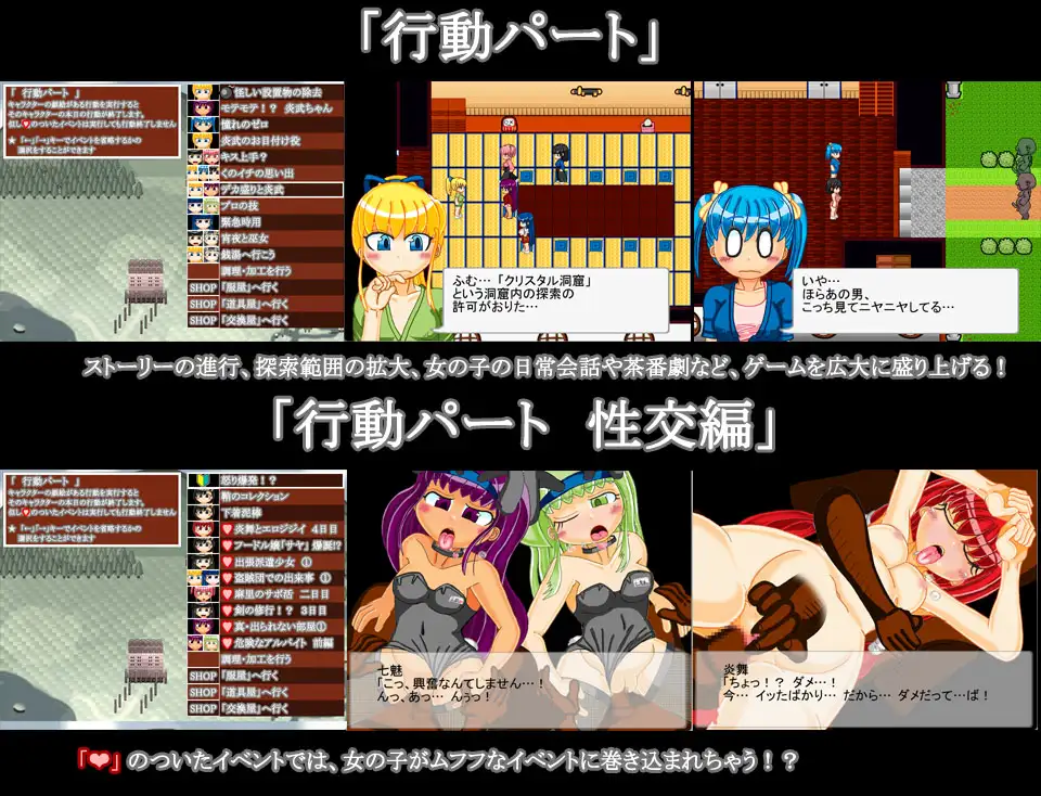據點的行動指令可以商店買賣東西、進行包括遊戲教學在內的各種主線劇情、角色支線、色情事件等。